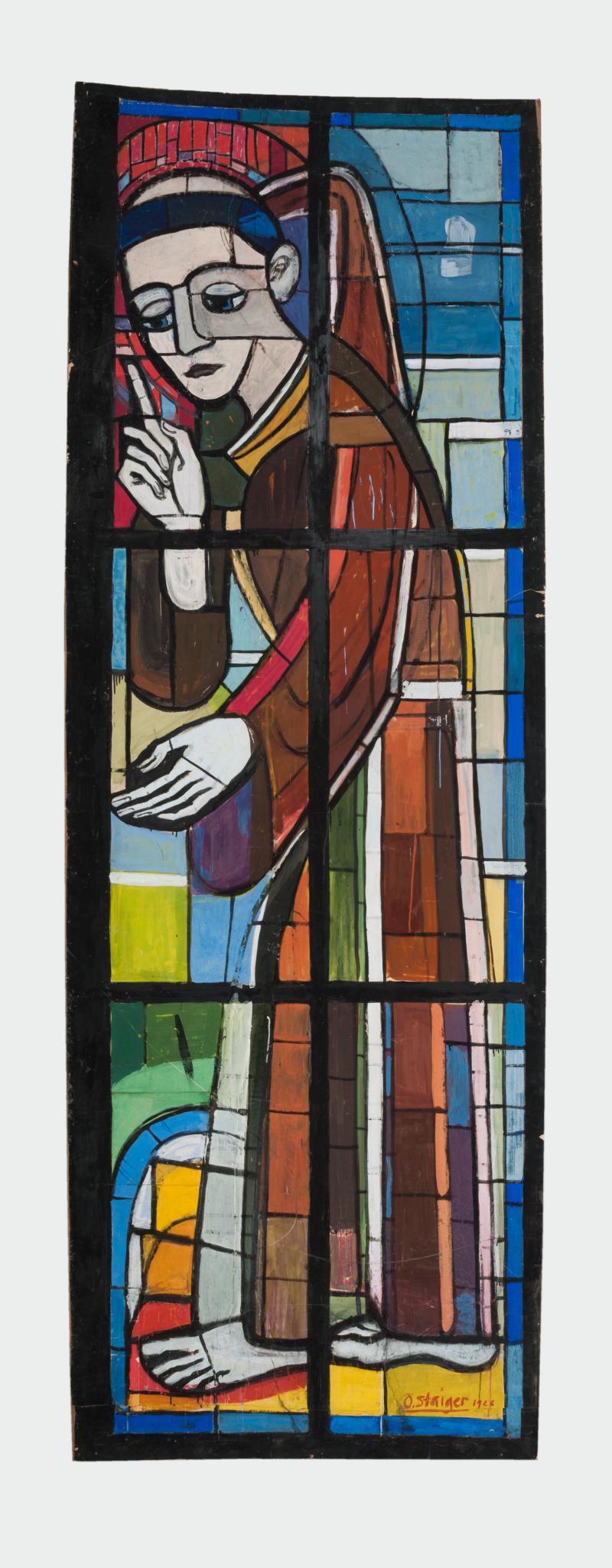 Ce carton correspond à la partie droite d’une scène tirée de la vie de saint Antoine, son sermon aux poissons: on y voit le saint en train de prêcher, levant son index droit. Les poissons se trouvent sur la partie gauche, représentée sur un carton séparé (VMR_1320). La scène occupe un huitième de la surface totale du vitrail réalisé en 1927 pour l’Antoniuskirche à Bâle et situé sur la paroi occidentale de l’église, deuxième fenêtre depuis l’entrée (BS_2). Il s’agit de la première fenêtre réalisée par Otto Staiger dans l’église. Le carton a été marouflé sur pavatex en 1982. Le Vitromusée conserve également deux maquettes de ce vitrail, l’une illustrant uniquement sur l’encadrement ornemental (VMR_1241), l’autre incluant une esquisse de la scène (VMR_1242).