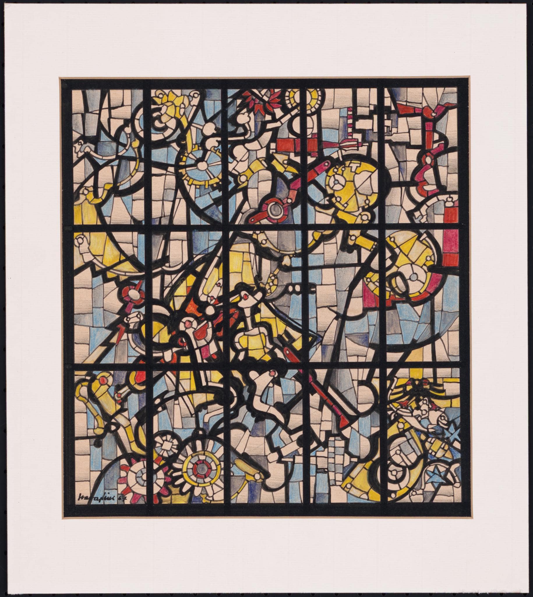 Maquette pour une dalle de verre représentant de manière stylisée le mouvement d’une montre mécanique, avec des roues, des pignons et d’autres pièces de mécanique horlogère. Les motifs, jaunes et rouges, se détachent sur un fond bleu ciel et blanc. En bas à droite sont évoquées les armoiries Fischer (deux poissons d’argent) et d’autres armoiries, sans doute Hediger (deux étoiles d’azur entourant un objet d’or non identifié sur fond azur), accompagnées d’une aigle bicéphale de sable. La surface est divisée en quinze parties, correspondant aux panneaux de la dalle de verre réalisée.