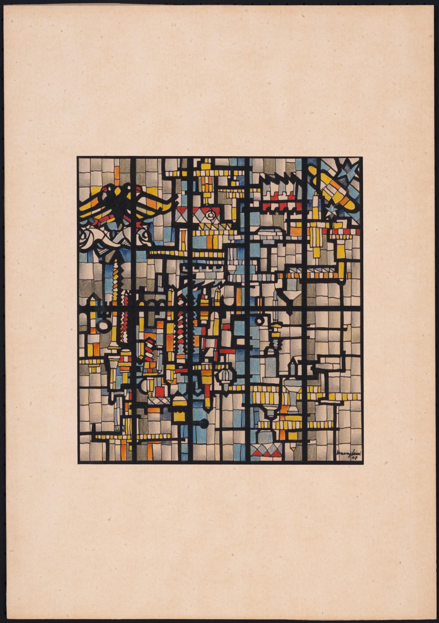 Cette maquette est un projet non retenu pour une dalle de verre monumentale réalisée en 1967 pour la villa d’Alfred Fischer, directeur de la manufacture de montres Baumgartner Frères SA à Granges (SO), divisée en quinze panneaux. Peter Travaglini a proposé trois autres variantes au commanditaire (PT_1, PT_2, PT_3), toutes évoquant la thématique des montres et leurs mouvements mécaniques, ainsi que, de manière très stylisée, les armoiries Fischer et probablement celles de son épouse, née Hediger. C’est le projet PT_1 qui a été choisi.