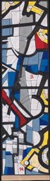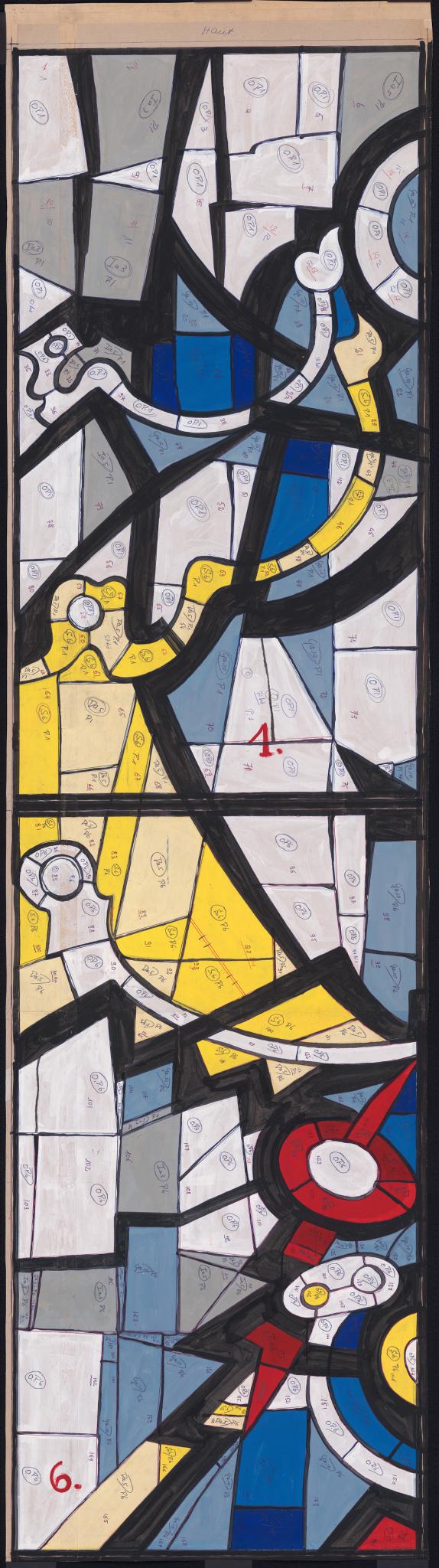 Ce carton correspond aux premiers panneaux des registres supérieur et médian (N° 1 et 6) de la grande dalle de verre réalisée en 1967 à Granges (SO) pour la villa d’Alfred Fischer, alors directeur de la manufacture de montres Baumgartner Frères SA à Granges. La dalle est constituée de quinze panneaux, que l’artiste a numérotés de 1 à 15, de gauche à droite et de haut en bas. La maquette PT_1 en présente la totalité. Sur le carton, les gros chiffres rouges 1 et 6 indiquent les numéros des panneaux, alors que les autres inscriptions (chiffres et lettres) se rapportent d’une part à la numérotation des pièces de verre (de 1 à 80 sur le panneau 1, de 81 à 173 sur le panneau 6), d’autre part aux références des couleurs choisies.