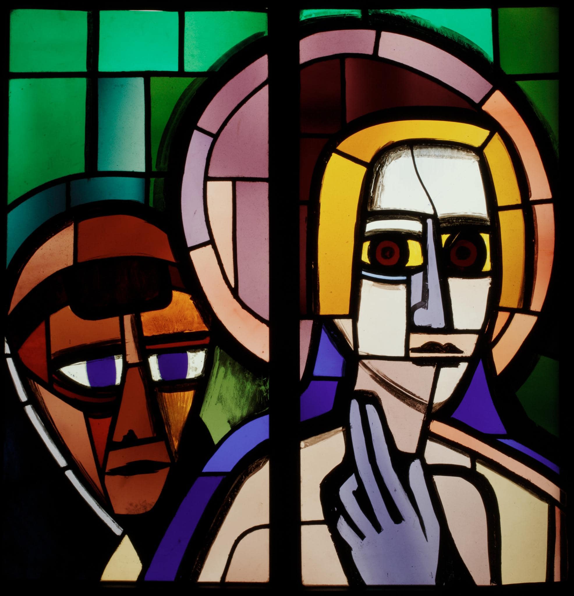 Die zweiteilige Bleiverglasung ist ein Probestück für die Verglasung der Antoniuskirche in Basel. Es zeigt zwei Köpfe vor grünem Hintergrund. Im Vordergrund ist im rechten Bildteil Christus dargestellt, der geradeaus blickt und seine linke Hand zum Segnen erhoben hat. Mit seinem Nimbus und seiner rechten Schulter greift er in das linke Bildfeld hinein. In diesem ist hinter Christus wohl der heilige Antonius von Padua im Habit der Dominikaner statt der Franziskaner dargestellt.