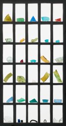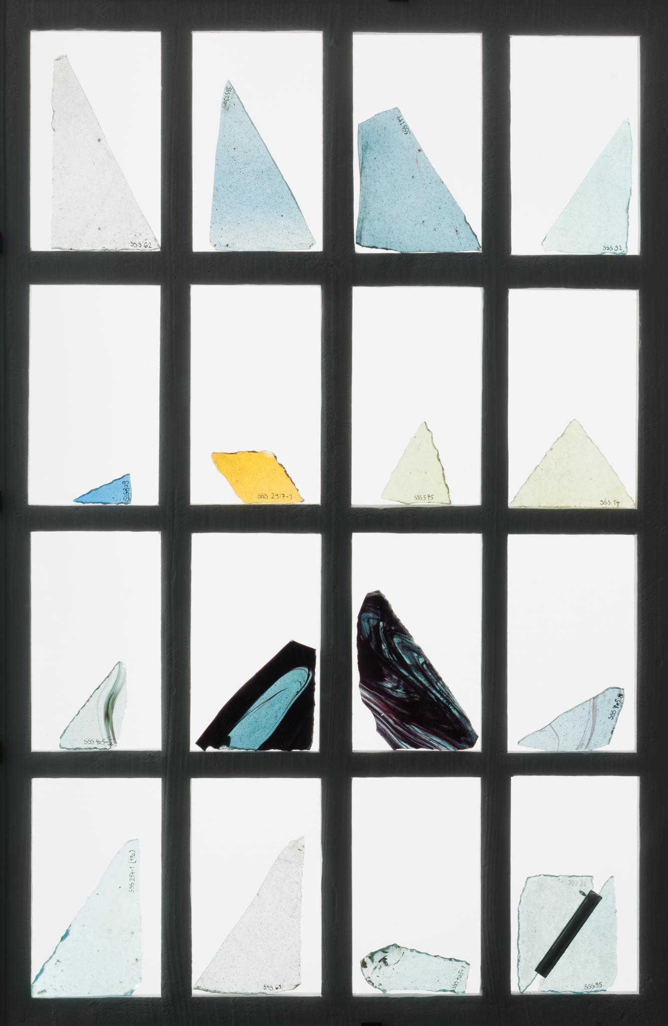 Dix-sept tessons de verres plats provenant de vitraux ornementaux mérovingiens. Les fragments sont de forme géométrique (majoritairement des triangles ou des losanges) et adoptent diverses teintes transparentes, tirant parfois légèrement sur le bleu, le vert ou le jaune. Les fragments aux teintes rouges sont plus opaques et certains présentent des stries. Les numéros d’inventaire sont inscrits à l’encre noire. L’épaisseur très fine, la surface irrégulière et les bords grugés sont caractéristiques des verres de cette période.