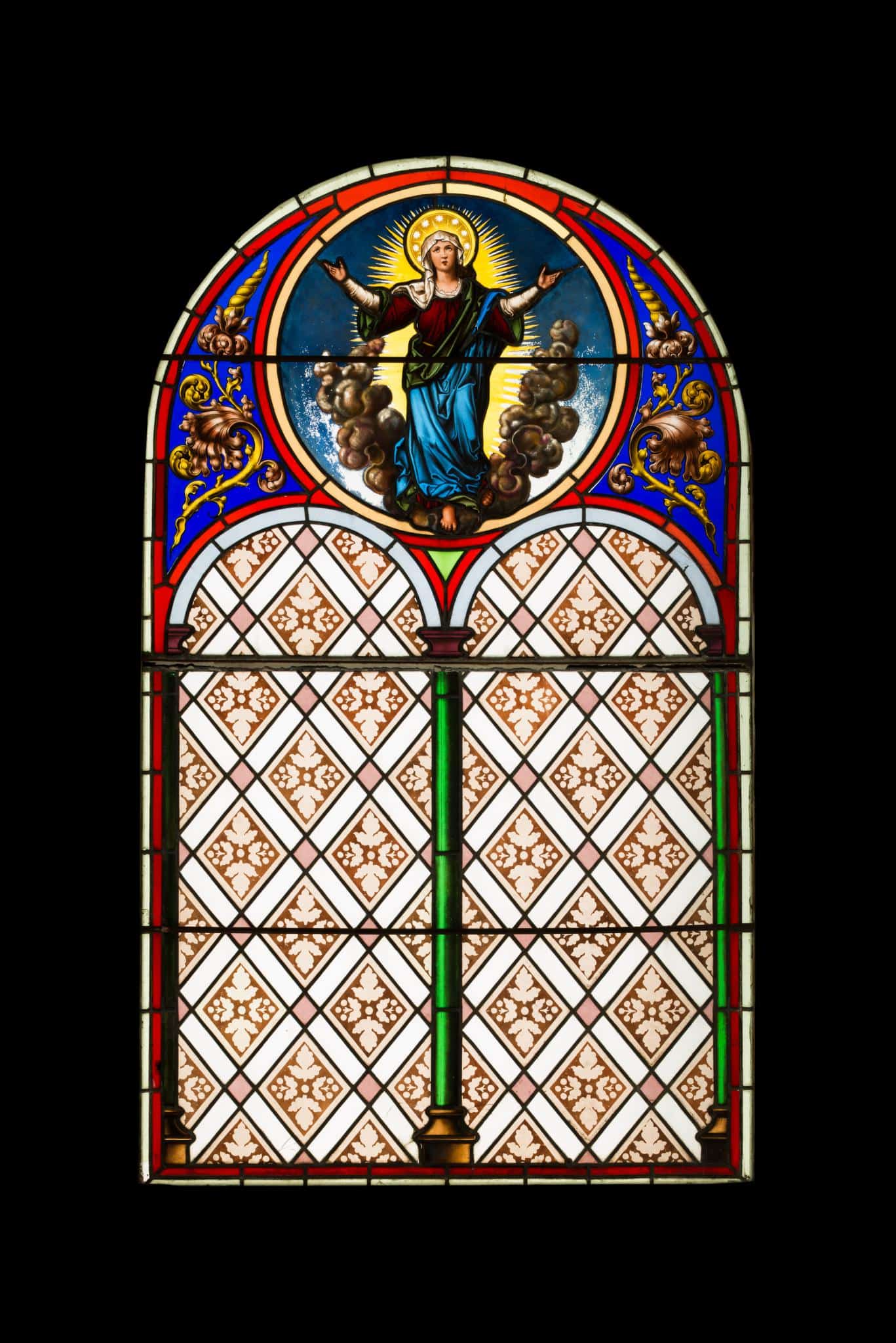 Vitrail au plomb pour une fenêtre en plein cintre. Dans la partie supérieure, un médaillon présente l’Assomption de la Vierge, avec de part et d’autre des motifs végétaux sur fond bleu. La partie inférieure montre deux arcs en plein cintre, portés par trois colonnes vertes, avec un fond de vitrerie composite (losange et motifs végétaux).