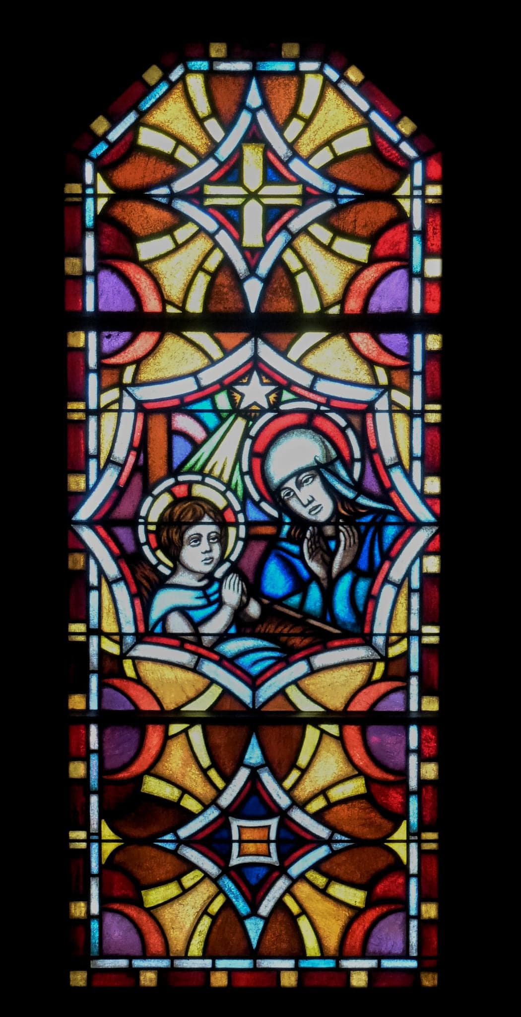 Vitrail composé de trois panneaux. Au centre d’un encadrement ornemental coloré, dans un médaillon octogonal : Jésus, les mains jointes, est assis dans une mangeoire. La lumière de l’étoile de Bethléem tombe sur lui. A droite, la Vierge le regarde, les mains ouvertes devant elle.