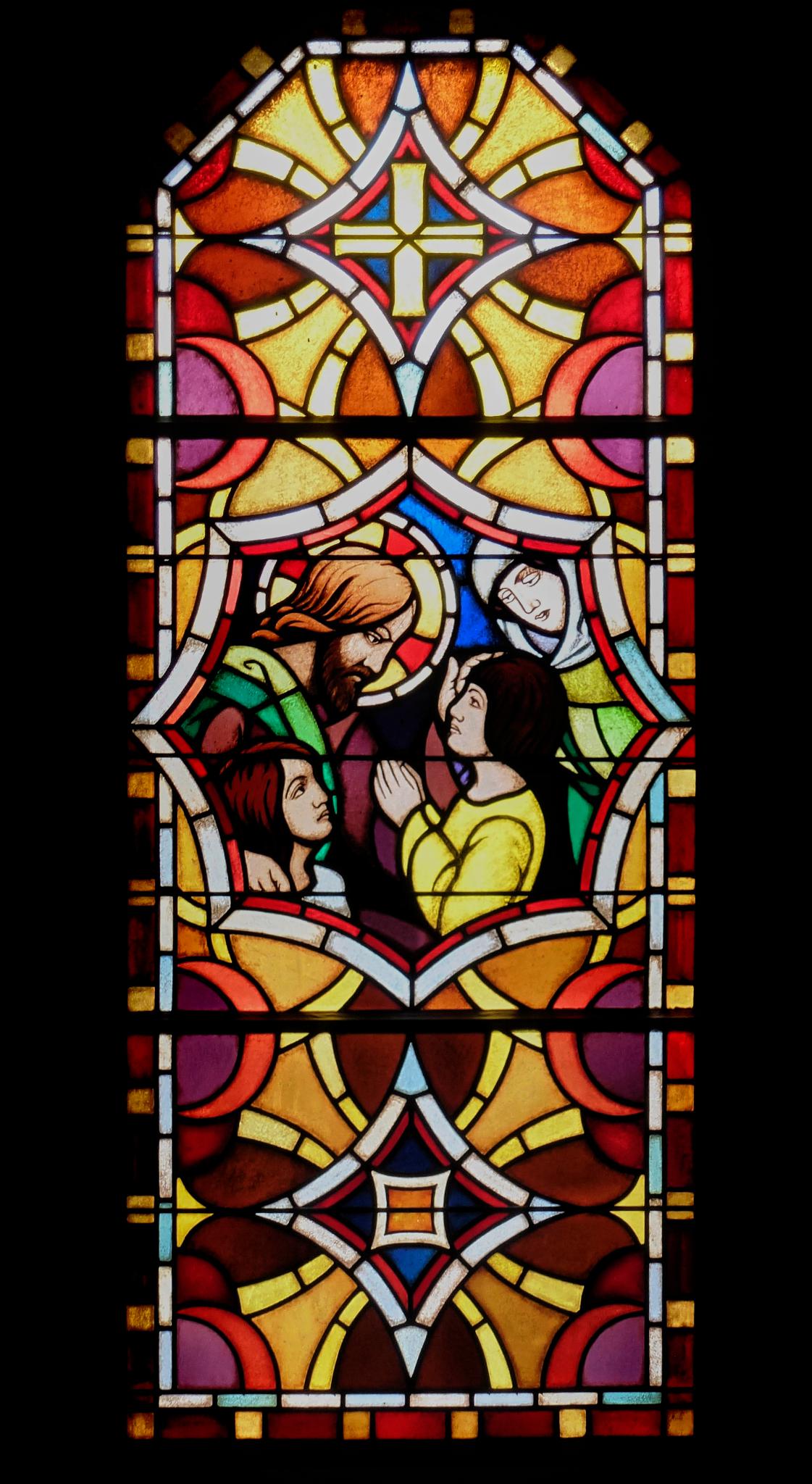 Vitrail composé de trois panneaux. Au centre d’un encadrement ornemental coloré, dans un médaillon octogonal : le Christ de profil bénit un jeune garçon qui lui fait face de sa main gauche. De la droite il tient une fille par l’épaule. A droite, une femme les regarde.