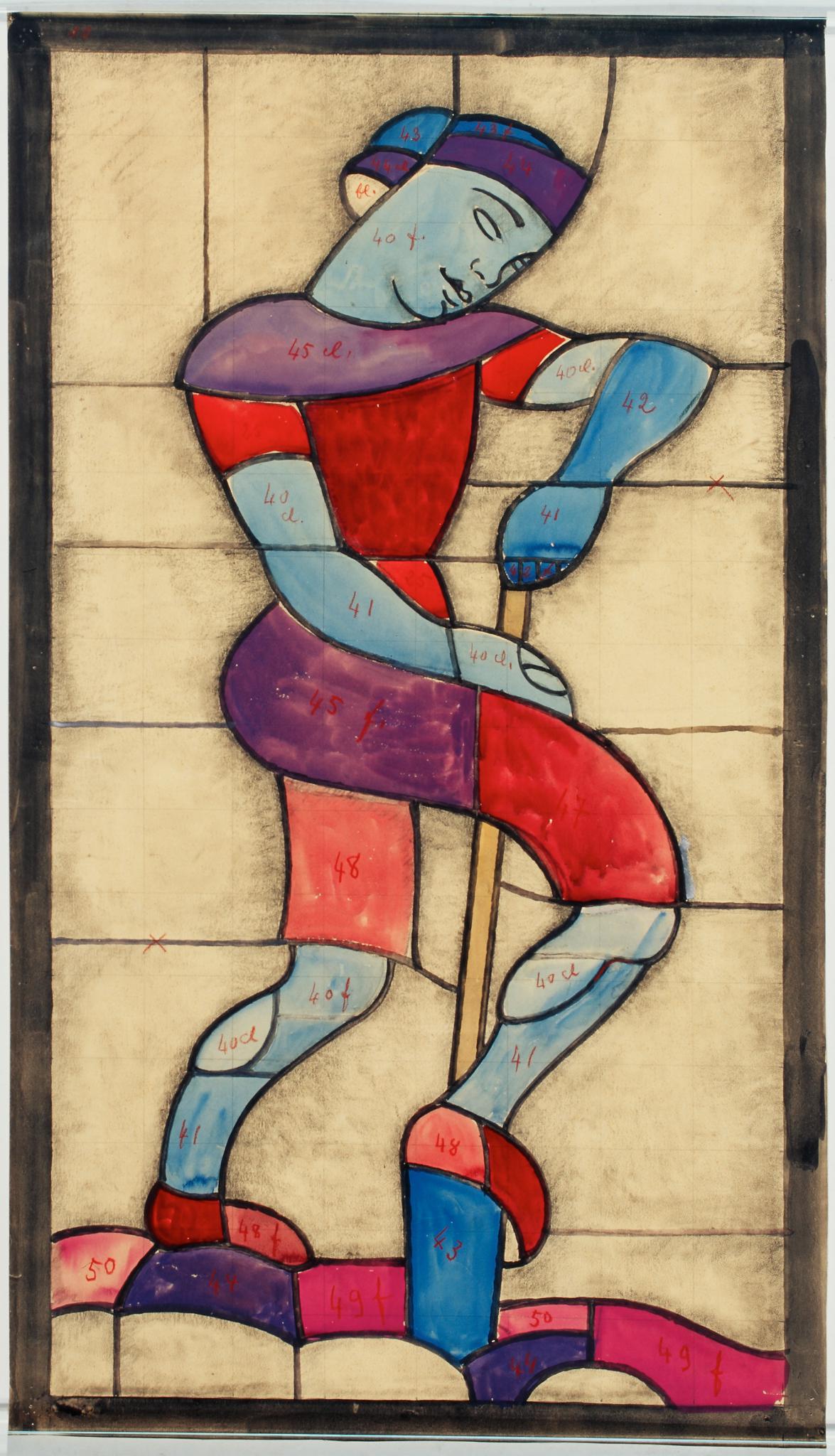 Ce carton en couleur est le modèle précis à l’échelle 1:1 du panneau inférieur droit de la fenêtre centrale pour l’école primaire de la Vignettaz à Fribourg. Ce cycle de douze vitraux se compose de trois fenêtres, constituées chacune de quatre panneaux. Il se situe sur la façade nord-ouest du bâtiment, dans la cage d’escalier au deuxième étage.