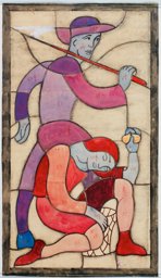Ce carton en couleur est le modèle précis à l’échelle 1:1 du panneau inférieur gauche de la fenêtre de droite pour l’école primaire de la Vignettaz à Fribourg. Ce cycle de douze vitraux se compose de trois fenêtres, constituées chacune de quatre panneaux. Il se situe sur la façade nord-ouest du bâtiment, dans la cage d’escalier au deuxième étage.