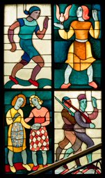 Réalisé par l’artiste Jean-Edouard de Castella et l’atelier fribourgeois Kirsch & Co, lors de la construction de l’école en 1949 (le vitrail du carton KF_381 est signé et daté en bas : „KIRSCH & Co J.E. de Castella 1949), cet ensemble de douze vitraux, d’apparence très simple, s’avère très subtil. La construction globale de cette grande paroi de verre joue sur les alternances : celle des sexes (homme-femme), du nombre de personnages (un ou deux), des fonds colorés (bleu-blanc) et des tons (chauds-froids). Elaborée sur la diagonale et l’horizontale, cette succession permet une lecture très aisée dégageant une sensation globale plaisante et ludique.
