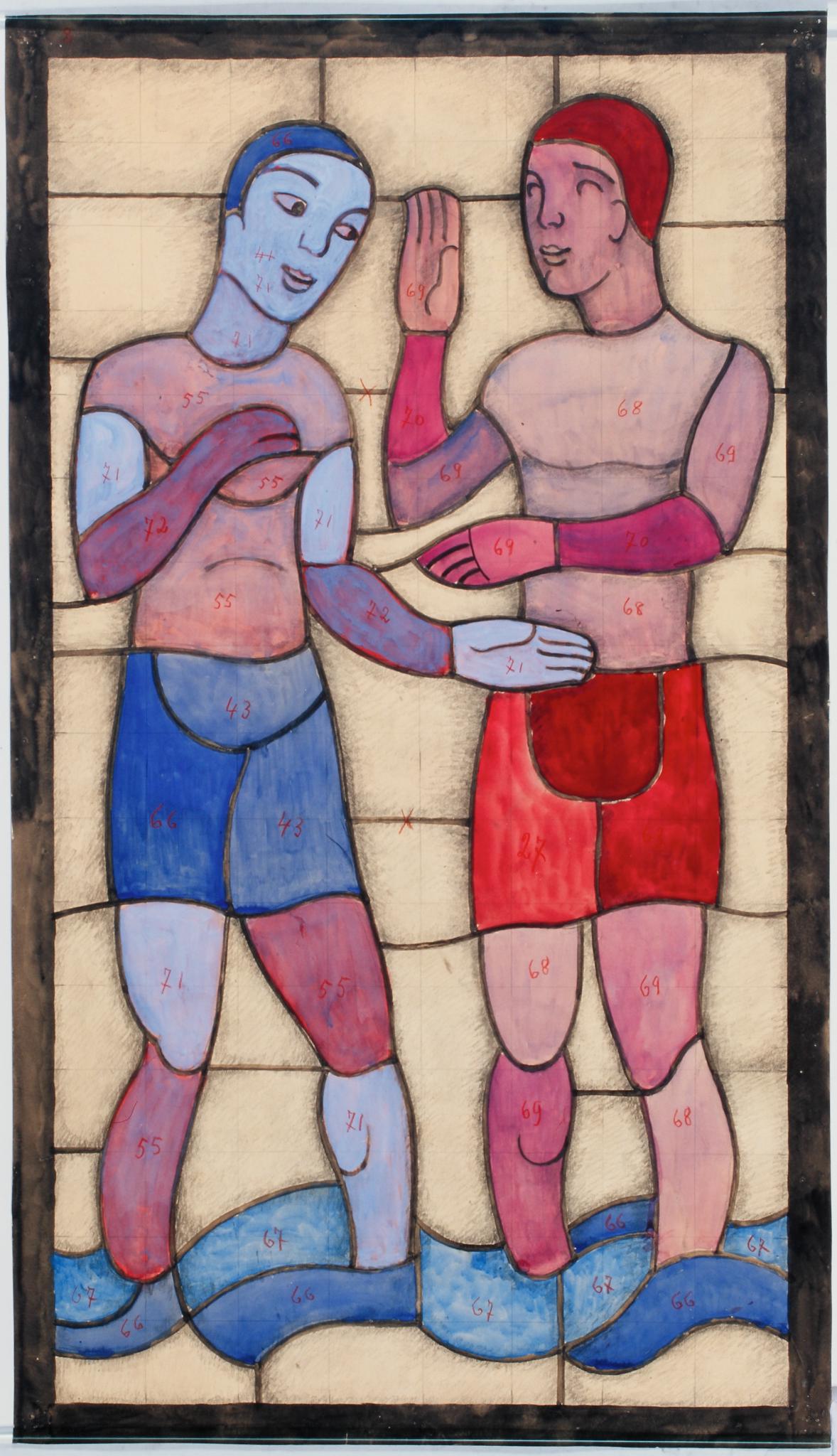 Ce carton en couleur est le modèle précis à l’échelle 1:1 du panneau inférieur droit de la fenêtre de gauche pour l’école primaire de la Vignettaz à Fribourg. Ce cycle de douze vitraux se compose de trois fenêtres, constituées chacune de quatre panneaux. Il se situe sur la façade nord-ouest du bâtiment, dans la cage d’escalier au deuxième étage.