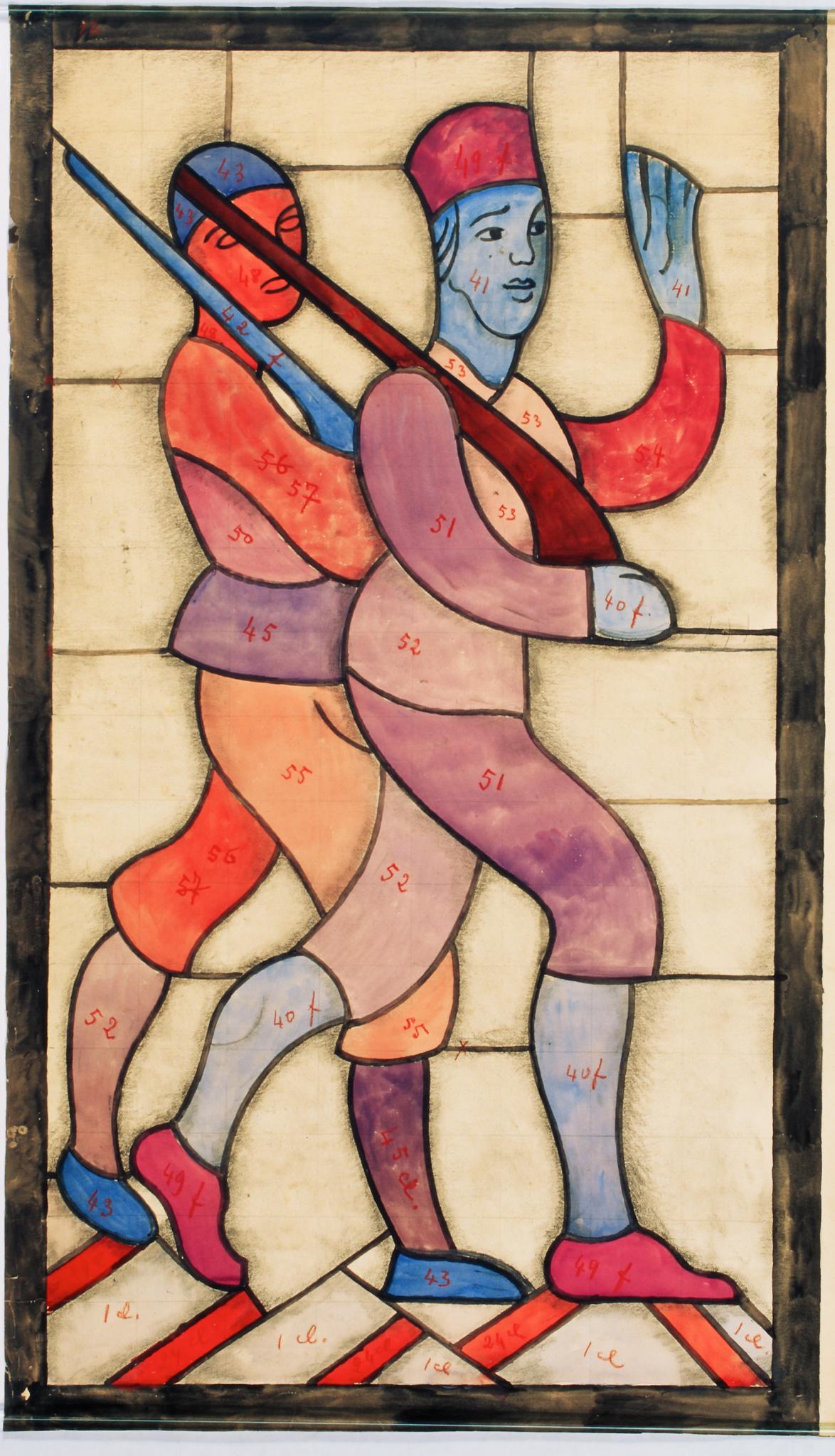 Ce carton en couleur est le modèle précis à l’échelle 1:1 du panneau inférieur droit de la fenêtre de droite pour l’école primaire de la Vignettaz à Fribourg. Ce cycle de douze vitraux se compose de trois fenêtres, constituées chacune de quatre panneaux. Il se situe sur la façade nord-ouest du bâtiment, dans la cage d’escalier au deuxième étage.