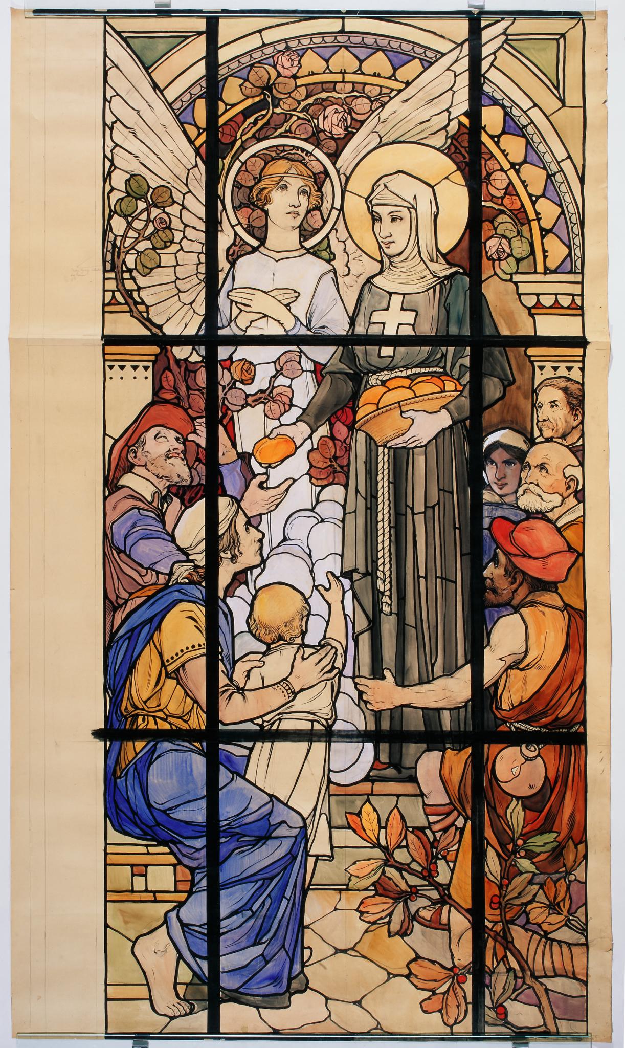 Ce carton est un projet à l’échelle 1:1 pour la cinquième fenêtre de gauche de la nef de l’église Saint-Etienne de Belfaux (FR), sanctuaire édifié en 1842-1851 par l’architecte Joseph Fidel Leimbacher et l’entrepreneur François Curty (Lauper, 2012, p. 250-251).
