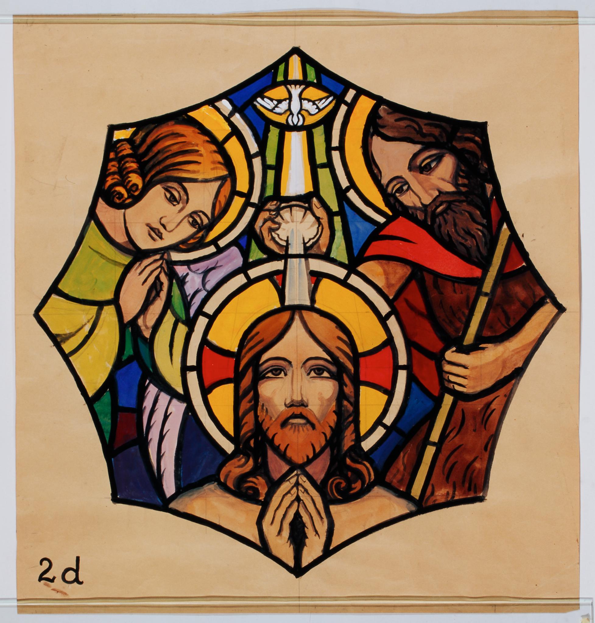 Ce carton en couleur est le modèle précis à l’échelle 1:1 de la partie figurée (octogone aux bords incurvés) du vitrail consacré au Baptême du Christ pour la quatrième fenêtre à droite de la chapelle du Sacré-Coeur de l’EMS les Fauvettes à Montagny-la-Ville. Toute la partie ornementale manque et fait l’objet d’un carton séparé, le KF_1058.