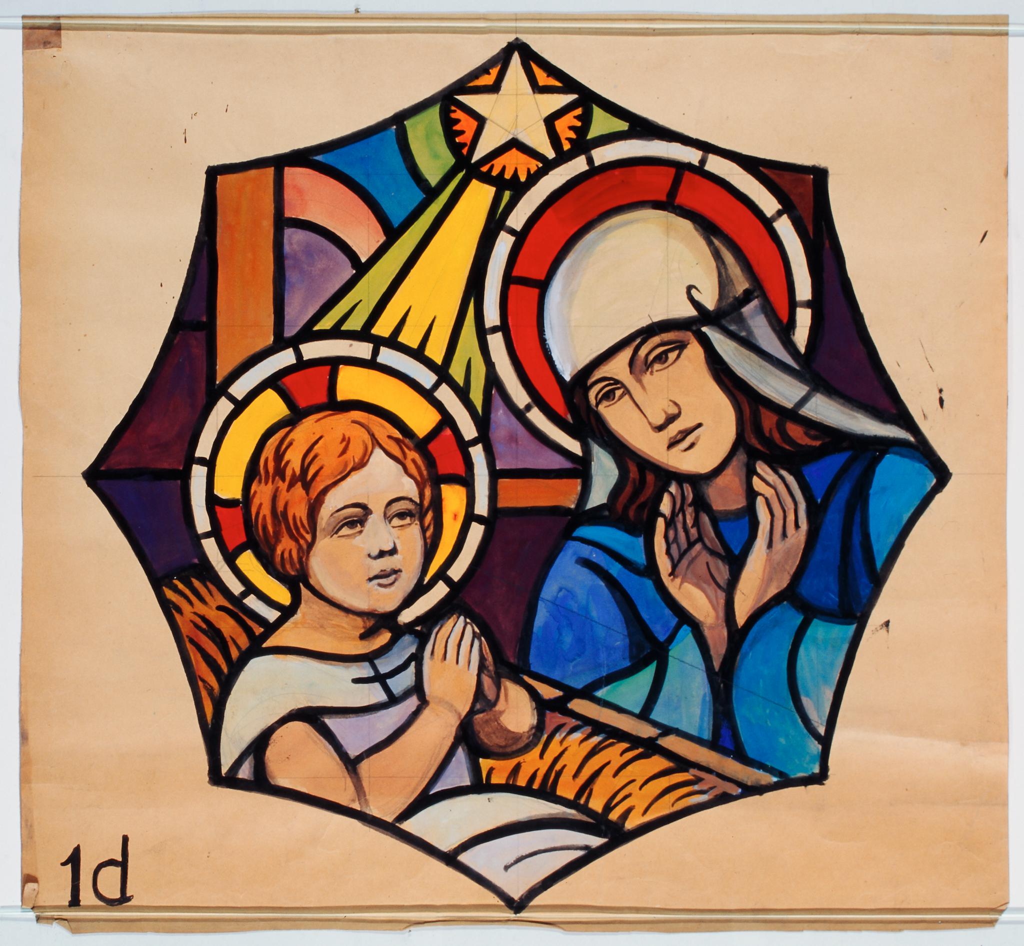 Ce carton en couleur est le modèle précis à l’échelle 1:1 de la partie figurée (octogone aux bords incurvés) du vitrail consacré à la Nativité pour la cinquième fenêtre à droite de la chapelle du Sacré-Coeur de l’EMS les fauvettes à Montagny-la-Ville. Toute la partie ornementale manque et fait l’objet d’un carton séparé, le KF_1058.
