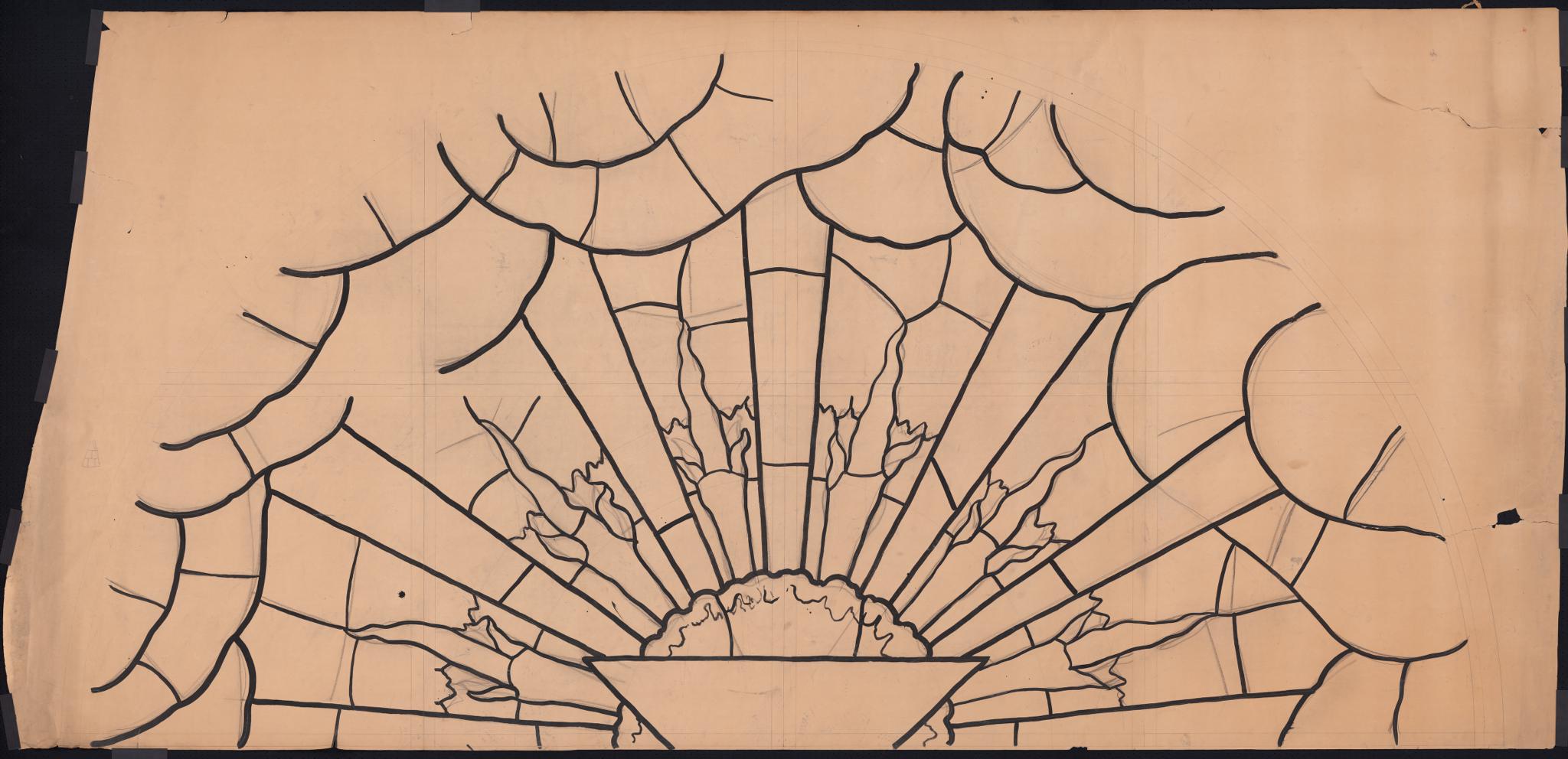 Ce carton est un projet à l’échelle 1:1 pour l’oculus situé dans la voûte du choeur de l’église Saint-Etienne de Belfaux (FR). Ce vitrail ne comporte aucune signature ni datation. Les deux cartons correspondent au vitrail, en dehors du triangle symbole de Dieu qui comprend une inscription alors qu’ici il est vide.