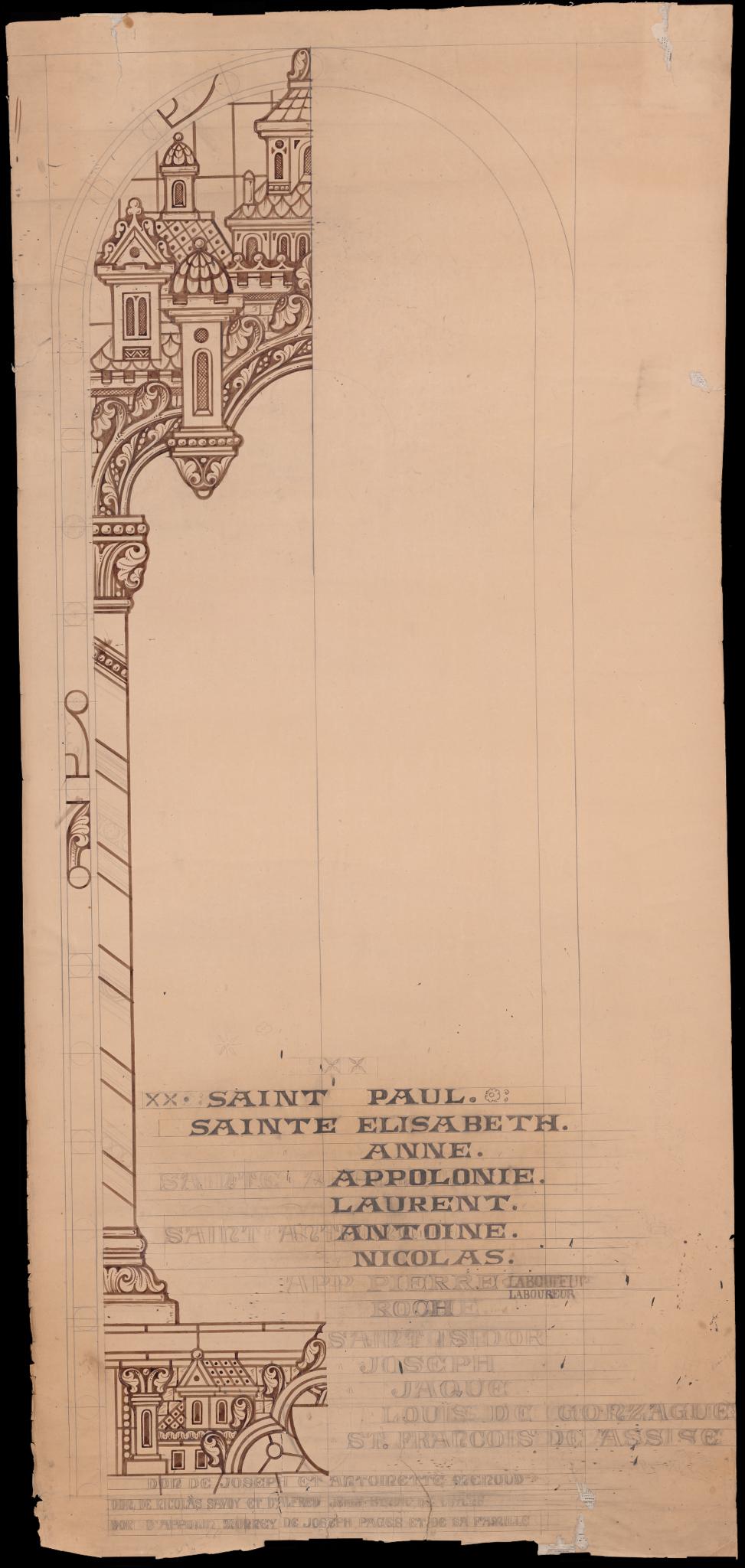 · SAINT’ PAUL. : / SAINTE ELISABETH. / ANNE. / SAINTE A[fin du nom sous le mot qui suit] APPOLONIE. / LAURENT. / SAINT ANT[fin du nom sous le mot qui suit]ANTOINE. / NICOLAS. / APP PIERRE LABOUREUR / LABOUREUR / ROCHE . / SAINT ISIDOR / JOSEPH / JAQUE / LOUIS DE GONZAGUE / St. FRANCOIS DE ASSISE (dans la partie inférieure)