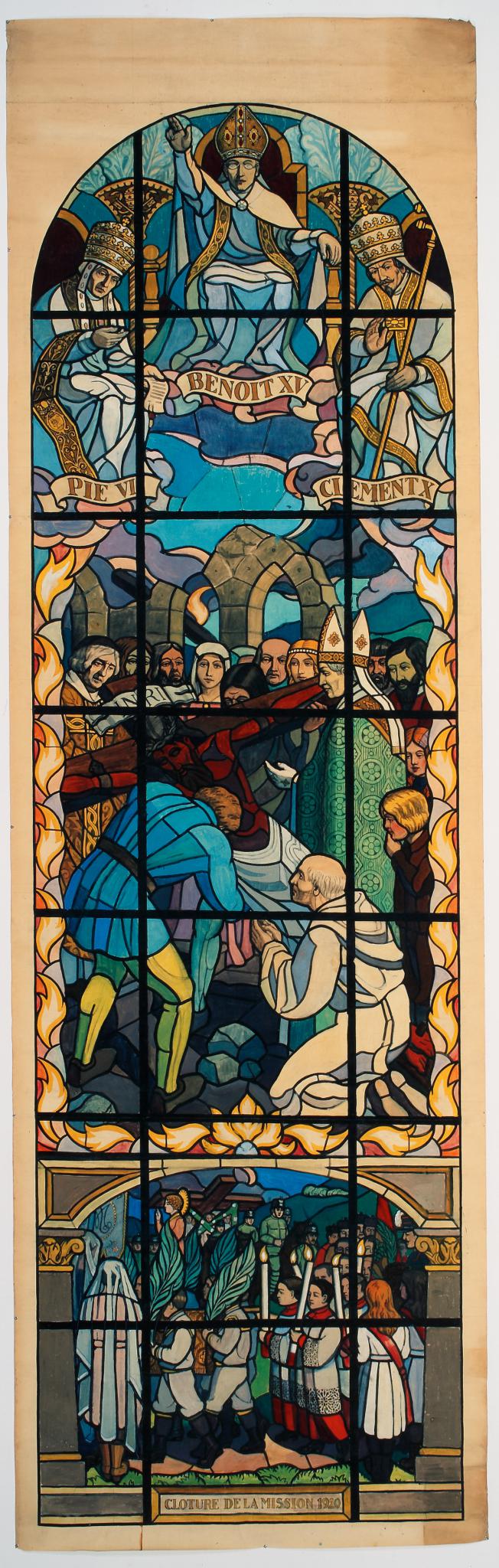 Nous ne savons pas pour quelles raisons ces deux vitraux de la nef ont été réalisés avec un tel écart temporel. Etait-ce pour des raisons financières? Existait-il néanmoins un projet datant de 1908 pour cette verrière de droite qui n’aurait pas été réalisé ? Aucune maquette ou carton dans le fonds graphique de l’atelier n’a été trouvé qui permette de répondre à cette question.