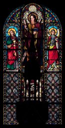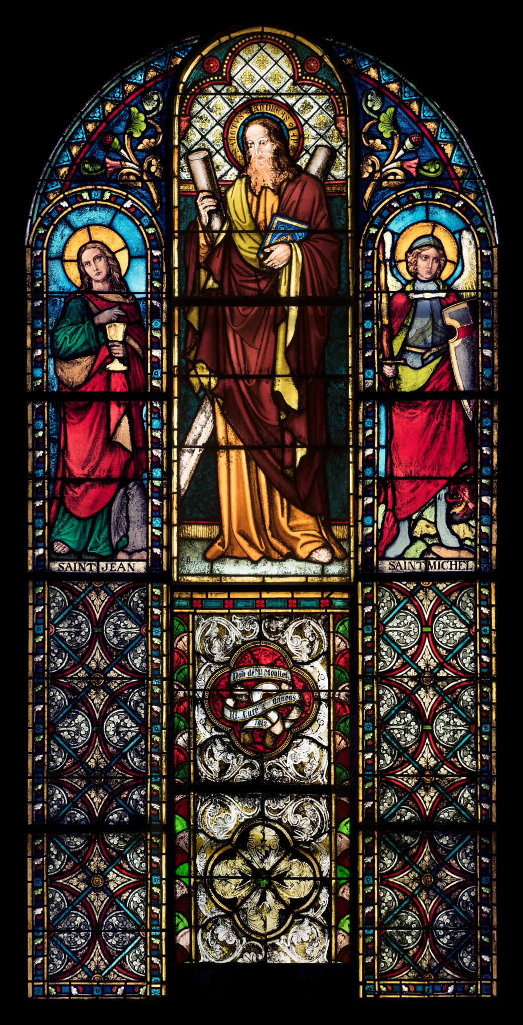 Ce vitrail à trois lancettes sur un fond ornemental présente dans chaque lancette un saint.