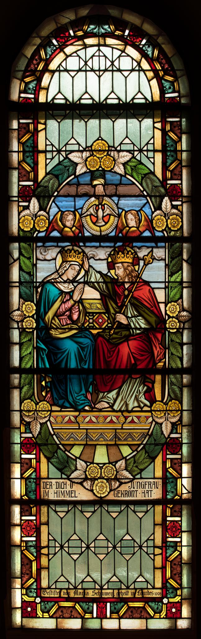 Au centre du vitrail se trouve une scène narrative dans un médaillon oblong : le Christ couronné est assis de profil sur un large trône richement décoré aux côtés de la Vierge. Il porte un sceptre de sa main gauche et de sa main droite dépose une couronne sur la tête de la Vierge qui se trouve à gauche. Elle est représentée de trois quarts, les mains jointes. En haut, la main de Dieu touche avec deux doigts la colombe de l’Esprit-Saint qui se trouve au centre d’un nimbe. De part et d’autre de celle-ci, on trouve deux anges. L’arrière-plan est composé de deux rangées de longs nuages.