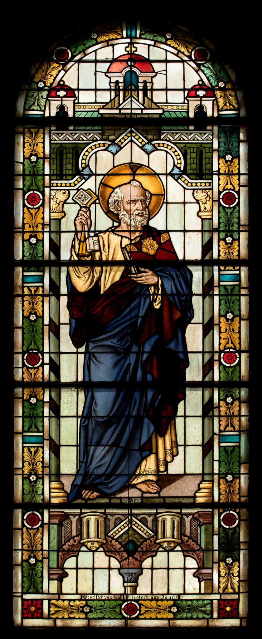 Saint Pierre, debout et présenté de trois quarts, se tient sous un dais architectural. Il porte dans sa main droite deux clefs et de la gauche un livre. Chauve avec une touffe de cheveux sur le devant, il porte la barbe. Il est vêtu d’une toge et d’un manteau. L’encadrement du vitrail est une bordure colorée constituée de fleurs, de feuilles et d’éléments géométriques.