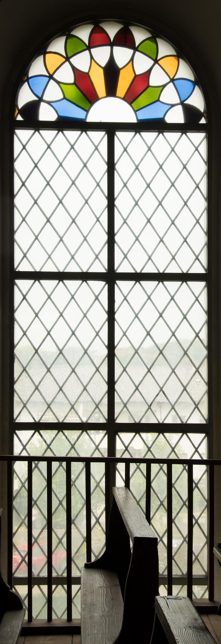 Basées sur le même dessin que les fenêtres à losanges de la nef, il existe encore neuf fenêtres incolores réparties entre le porche et le choeur.