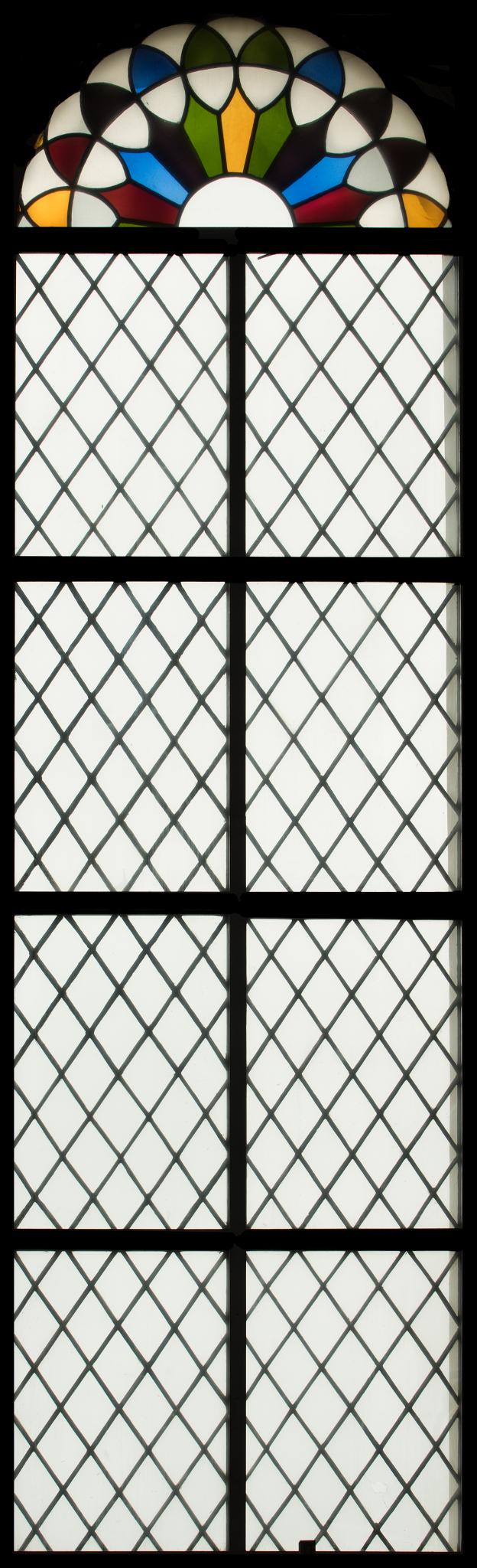 Verrière en plein cintre à losanges composée de verres blancs avec dans la partie supérieure une demi-fleur géométrique multicolore.