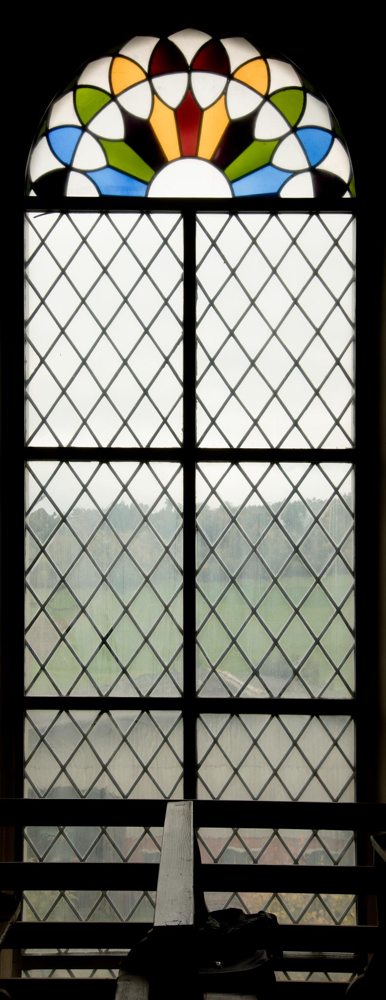 Basées sur le même dessin que les fenêtres à losanges de la nef, il existe encore neuf fenêtres incolores réparties entre le porche et le choeur.