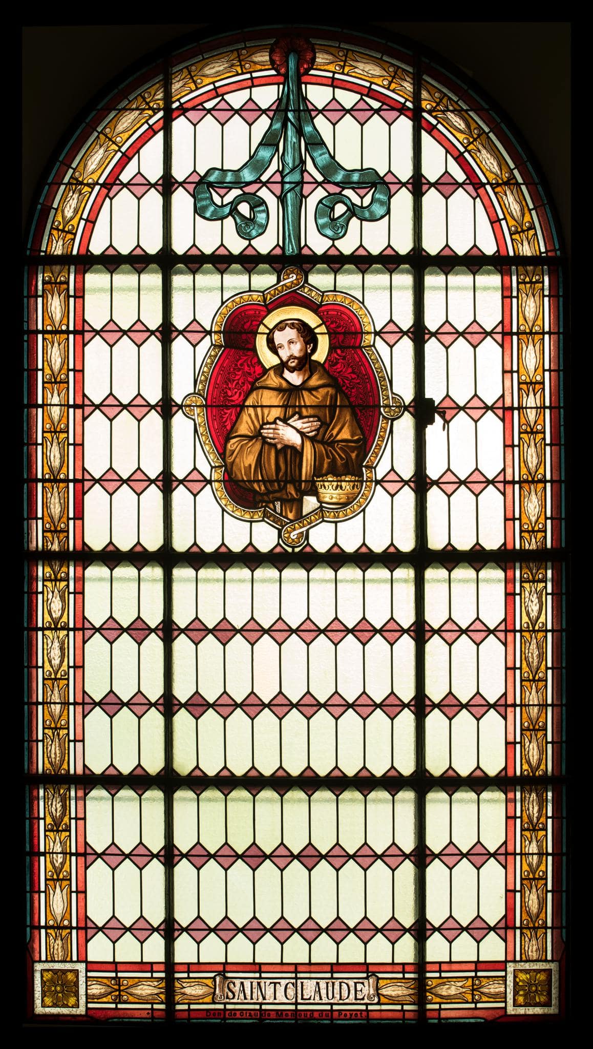 Dans un médaillon, saint Claude est représenté à mi-corps, tonsuré et vêtu de la bure, les mains croisées contre son torse, et sa tête auréolée légèrement penchée sur le côté. Une couronne est posée sur une table au premier plan. Le médaillon oblong est entouré d’une bordure formant des volutes, et semble suspendu à un ruban accroché à une couronne au sommet de la baie, dont les deux extrémités retombent symétriquement. Le fond de la verrière est composé de bornes en verre blanc. Une bordure à frise de fleurs ascendantes encadre l’ensemble. Un cartouche en forme de parchemin roulé est situé au bas de la fenêtre, et deux motifs de fleurs stylisées dans les extrémités inférieures.
