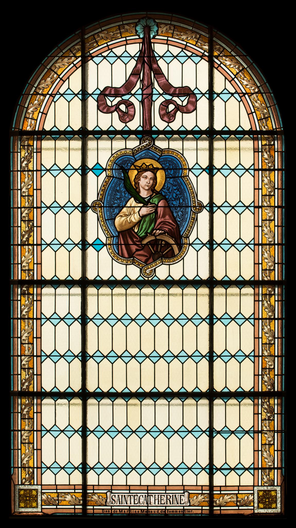 Cette verrière se situe dans la quatrième fenêtre de gauche de la nef de l’église Notre-Dame-de-la-Nativité de Vuisternens-devant-Romont, important édifice néo-classique du canton de Fribourg (Lauper, 2012, p. 204). Le cycle des vitraux de cette église a été réalisé par l’atelier Kirsch & Fleckner en 1906. Ce vitrail est un don de Martine Menoud de Sommentier, comme l’indique l’inscription s’y trouvant.