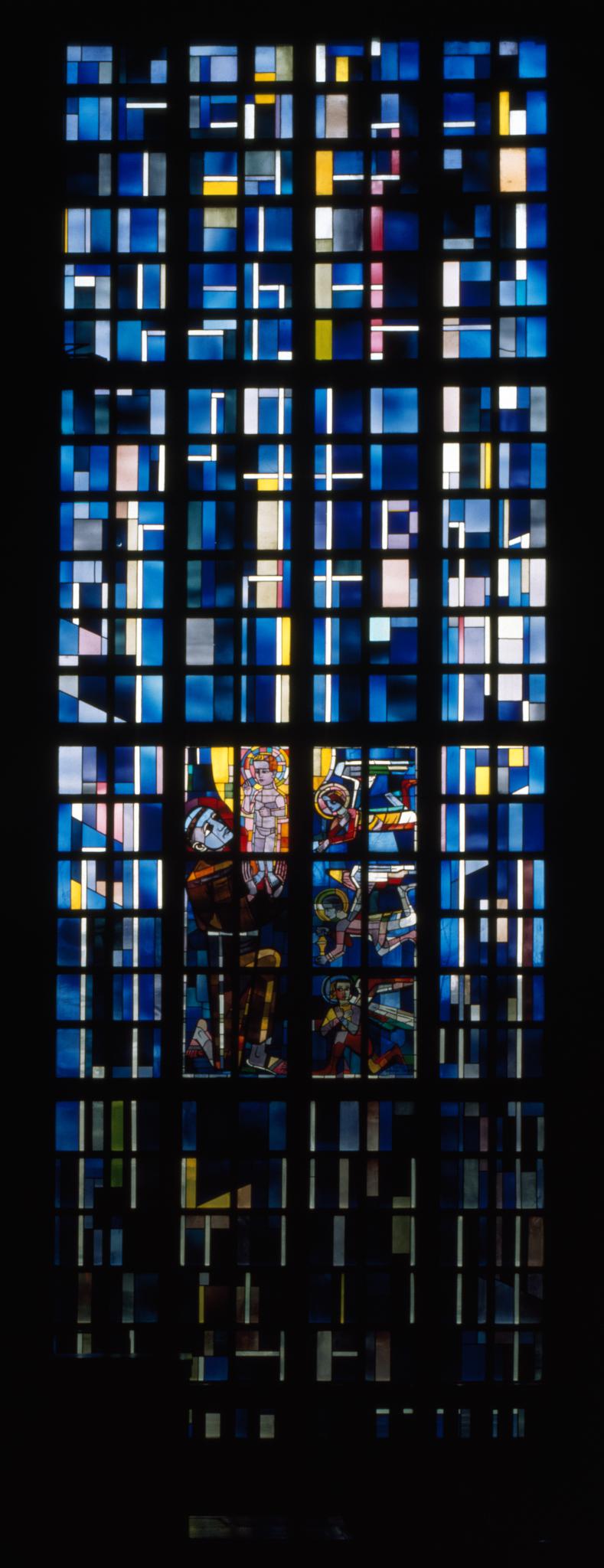 Die figürlichen Felder stellen die Erscheinung des Jesuskinds vor dem hl. Antonius dar. Der kniende Antonius sieht mit gefalteten Händen zu dem vor einer Gloriole stehenden Jesuskind hinauf. Auf der rechten Seite sehen drei Engel der Szene zu. Der unterste Engel kniet, der mittlere hält einen Kelch in den Händen und der oberste weist auf die Szene hin. Die ornamentale Verglasung (7/8 der Gesamtfläche) zeigt eine geometrische Komposition aus vorwiegend bläulichen Gläsern, die mit weissen Bändern und einigen gelben Tupfen belebt wird. Die ornamentale Rahmenverglasung setzt sich als Hintergrund in der Szene fort.