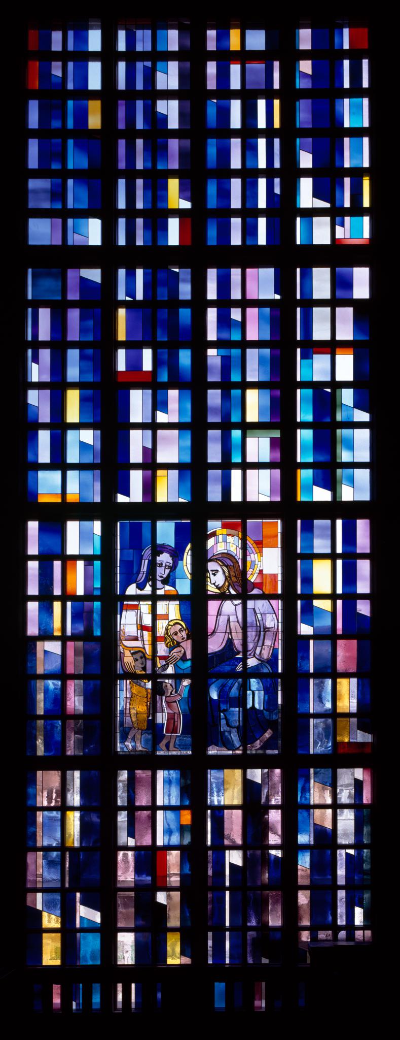 Die ornamentale Rahmenverglasung (7/8 der Gesamtfläche) zeigt eine geometrische Komposition aus mehrheitlich blauen und weissen Gläsern, in die einige rosa, violette und gelbe Farbtupfen Rhythmus hineinbringen.