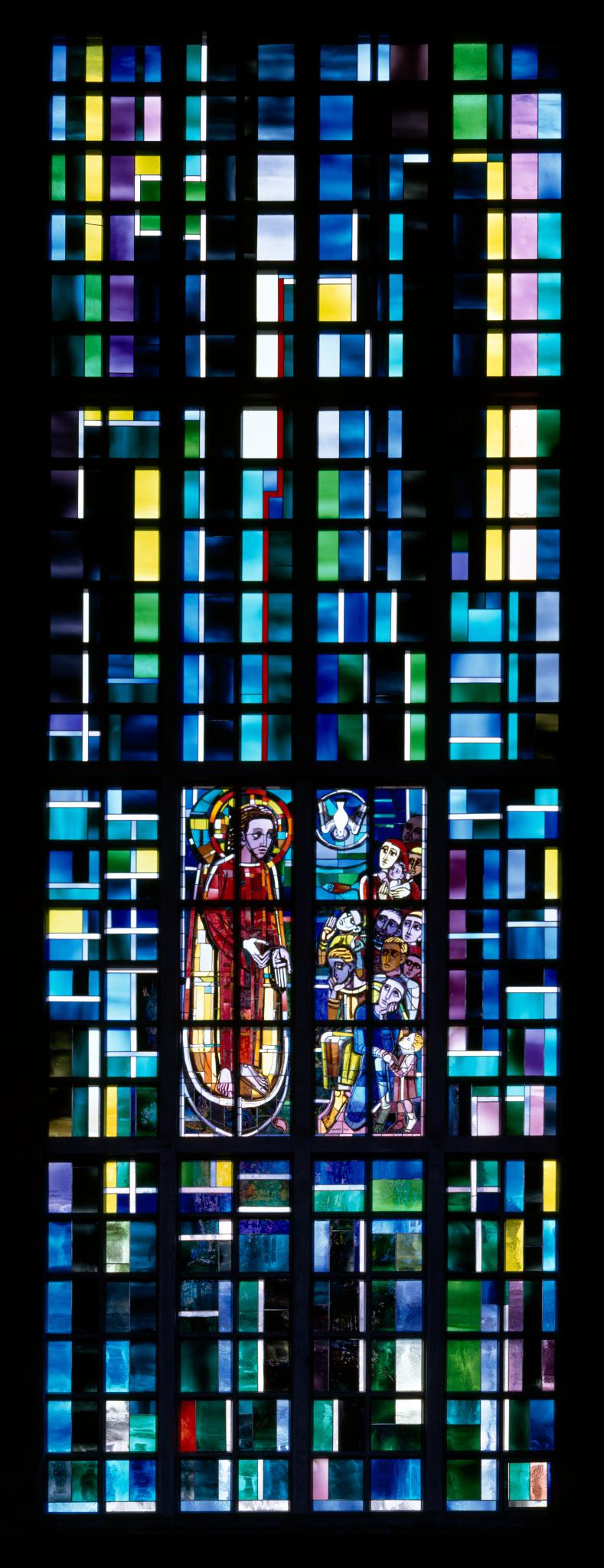 Die ornamentale Rahmenverglasung (7/8 der Gesamtfläche) zeigt eine geometrische Komposition aus vorwiegend blauen und grünen Gläsern mit einigen violetten, gelben und weissen Einschlüssen.