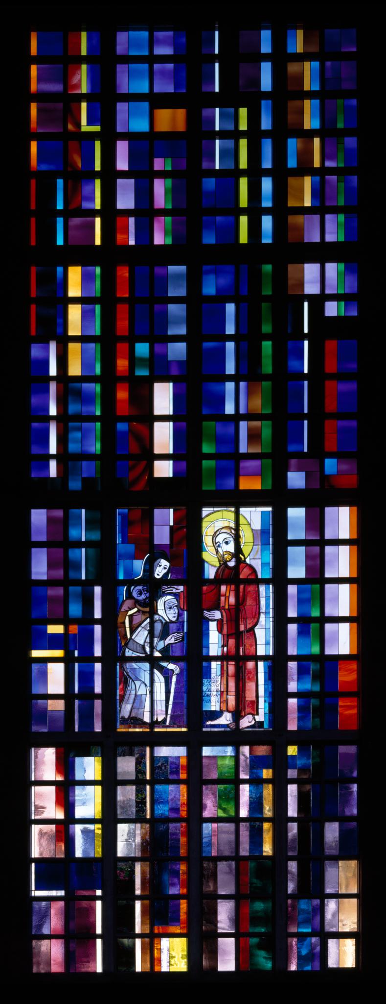 Die figürlichen Felder zeigen Jesus, der die Menschen zu sich ruft. Auf der rechte Seite ist der rot gekleidete Jesus stehend dargestellt. Ihm treten drei Figuren gegenüber, darunter eine alte Frau mit Stock, die ihren Blick auf ihn richtet. Die ornamentale Rahmenverglasung (7/8 der Gesamtfläche) zeigt eine geometrische Komposition aus vorwiegend blauen Gläsern, durchbrochen von einigen violetten, grünen, roten, gelben und weissen Gläsern.