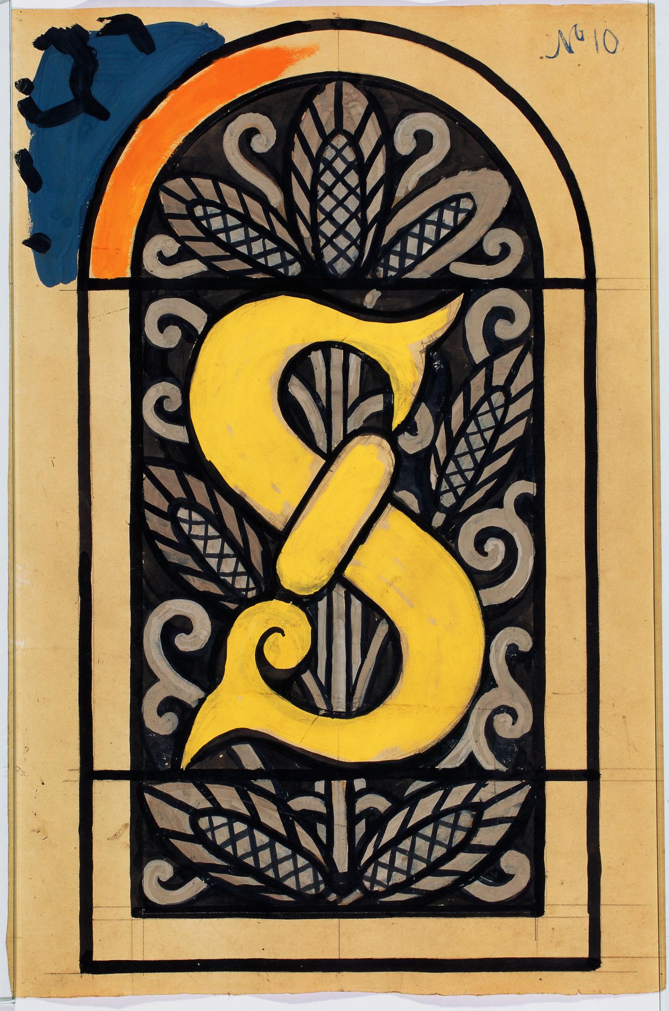 Ce carton est le modèle couleur précis à l’échelle 1:1 du petit vitrail illustrant la dernière des dix lettres composant les mots latins “panis vivus” (pain vivant) situé au-dessus des trois fenêtres du choeur de l’église Saints-Pierre-et-Paul à Villars-sur-Glâne. Aujourd’hui l’ensemble des ces dix petits vitraux a été déposé pour laisser place à des fenêtres à bornes.