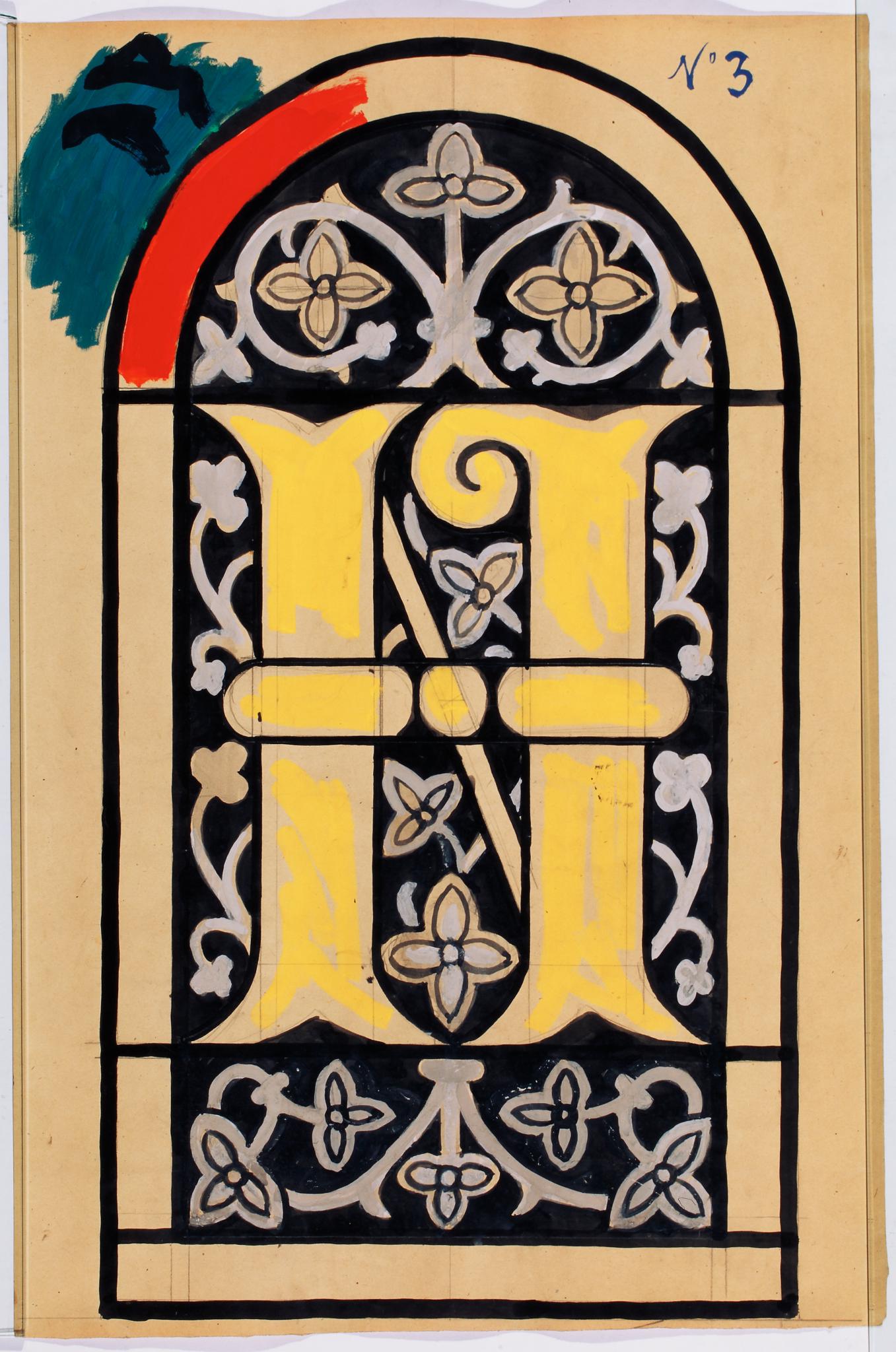 choisie pour l’arrière-plan ornemental de chaque lettre. Les vitraux ayant aujourd’hui disparu, cette hypothèse n’a pas pu être vérifiée.