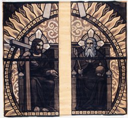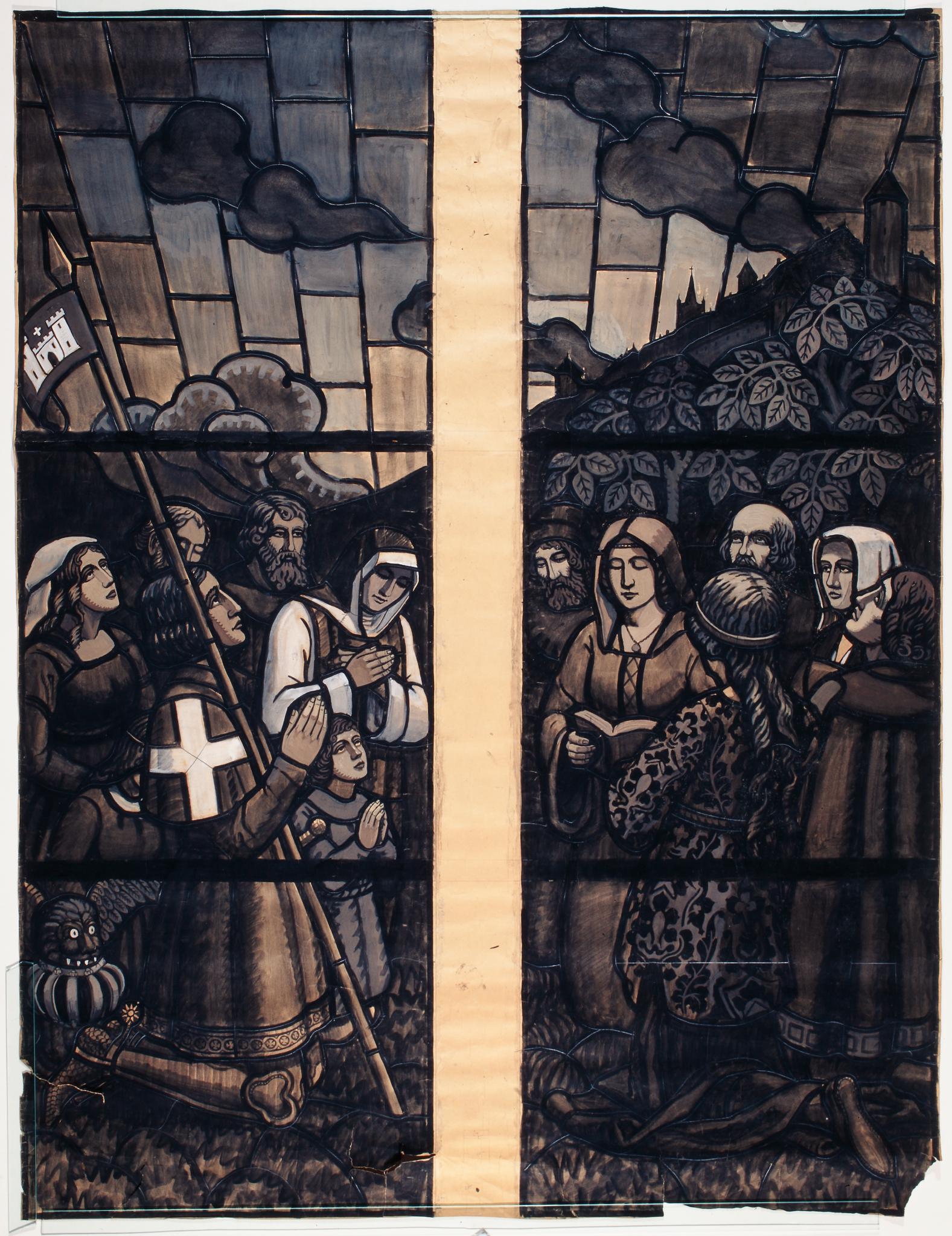 Ce carton en noir et blanc est le modèle précis à l’échelle 1:1 pour le second registre du vitrail consacré aux Romontois et leurs protecteurs implorant les bénédictions divines sur la cité et le pays, situé à droite dans le choeur de la collégiale de Romont, à côté de la verrière mariale de Friedrich Berbig récompensée par une médaille à l’Exposition Universelle de Paris en 1889 (Lauper, 2012, p. 196).