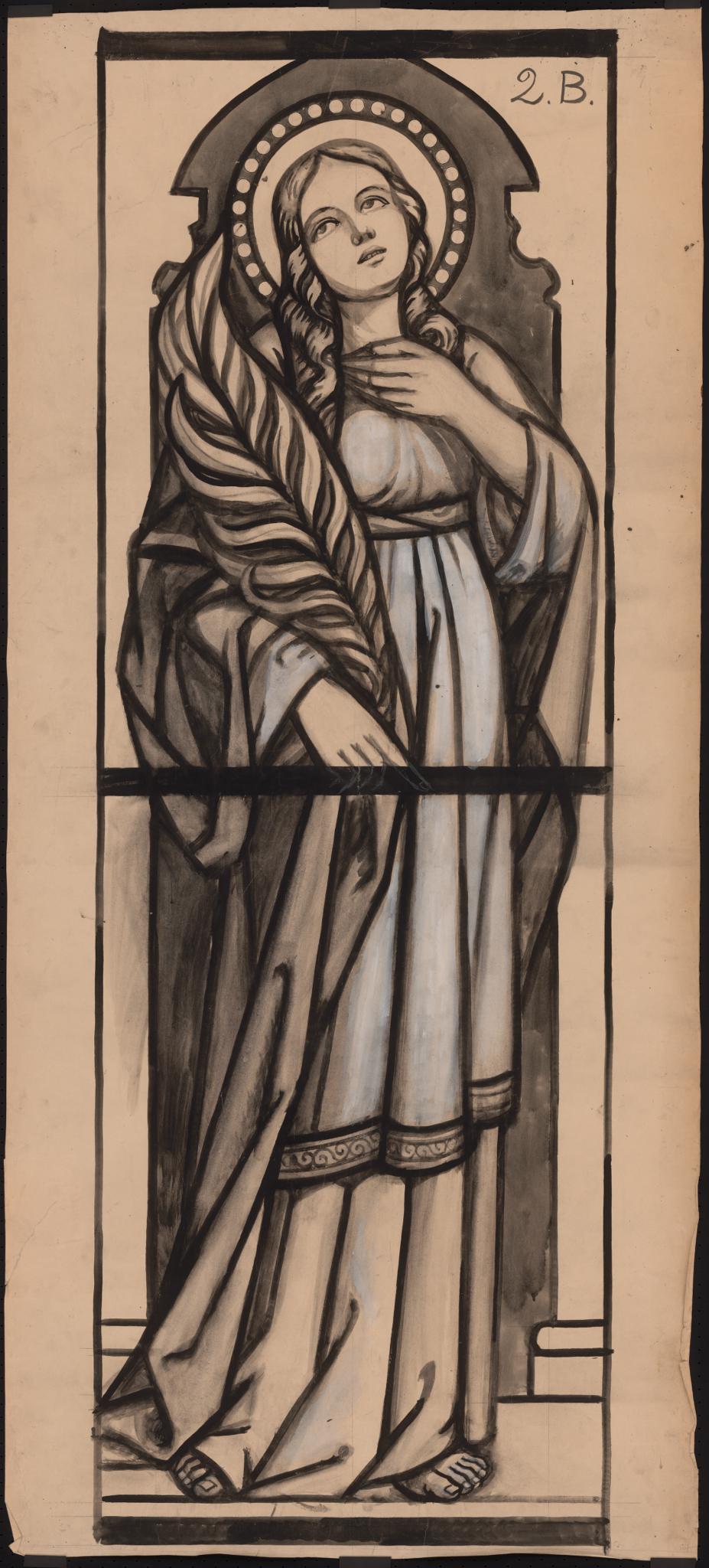 Ce carton en noir et blanc est le modèle précis à l’échelle 1:1 de la partie figurée gauche du vitrail à double lancettes consacré à sainte Cécile et sainte Barbe pour la première fenêtre à gauche dans la nef de l’église Saint-Jacques à Nuvilly. Le cadre ornemental fait l’objet d’un carton séparé, le KF_891, comme les ajours de réseau illustrés sur le KF_894 et le motif de la lyre dans la partie ornementale inférieure de la lancette, représentée sur la partie droite du carton KF_896.