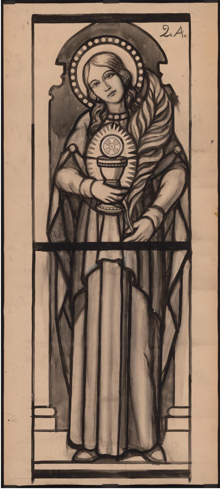Ce carton en noir et blanc est le modèle précis à l’échelle 1:1 de la partie figurée droite du vitrail à double lancettes consacré à sainte Cécile et sainte Barbe pour la première fenêtre à gauche dans la nef de l’église Saint-Jacques à Nuvilly. Le cadre ornemental fait l’objet d’un carton séparé, le KF_891, comme les ajours de réseau illustrés sur le KF_894 et le motif de la tour dans la partie ornementale inférieure de la lancette, représenté sur la partie droite du carton KF_895.