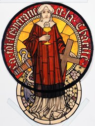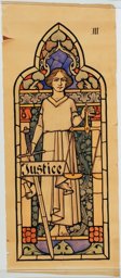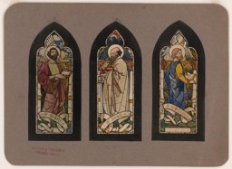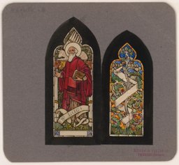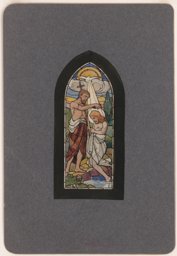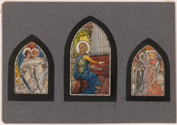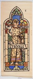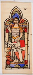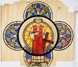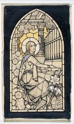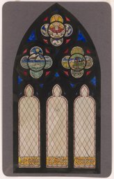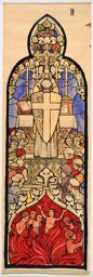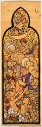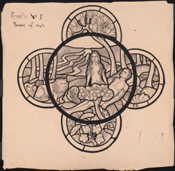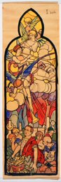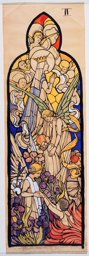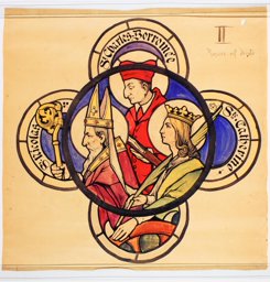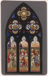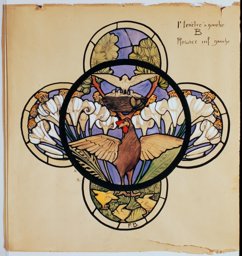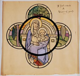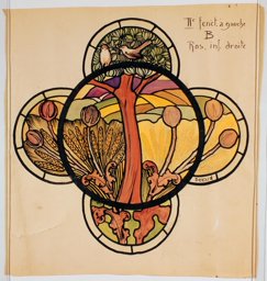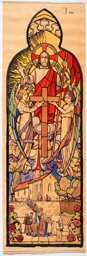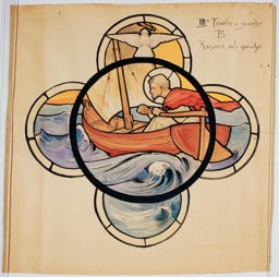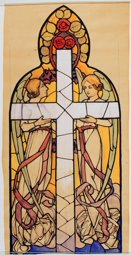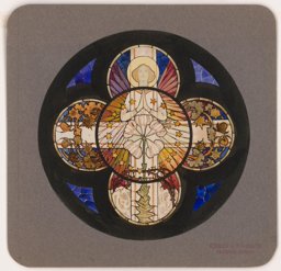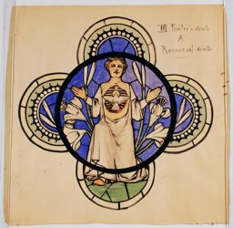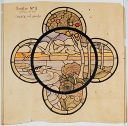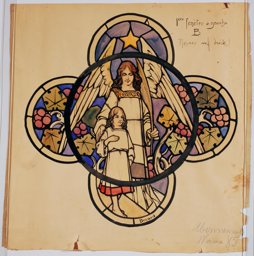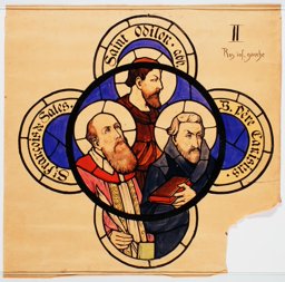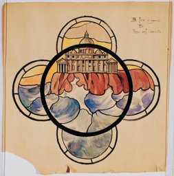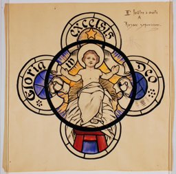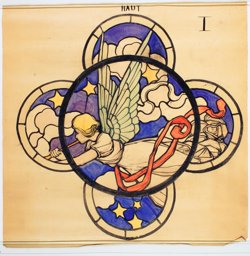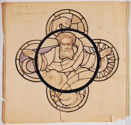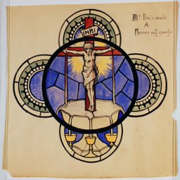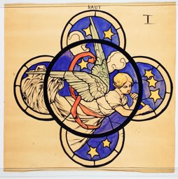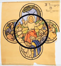 Ce carton en couleur à l’échelle 1:1 est le projet définitif pour le quadrilobe inférieur gauche du vitrail de la deuxième travée à droite de la nef de l’église Saint-Martin de Cugy, dédiée au thème “Je crois au fils de Dieu fait homme”. Cette fenêtre comprend deux autres quadrilobes dans lesquels sont représentées la Nativité et la Vierge à l’Enfant (Pasquier, 1999, p. 14-16).