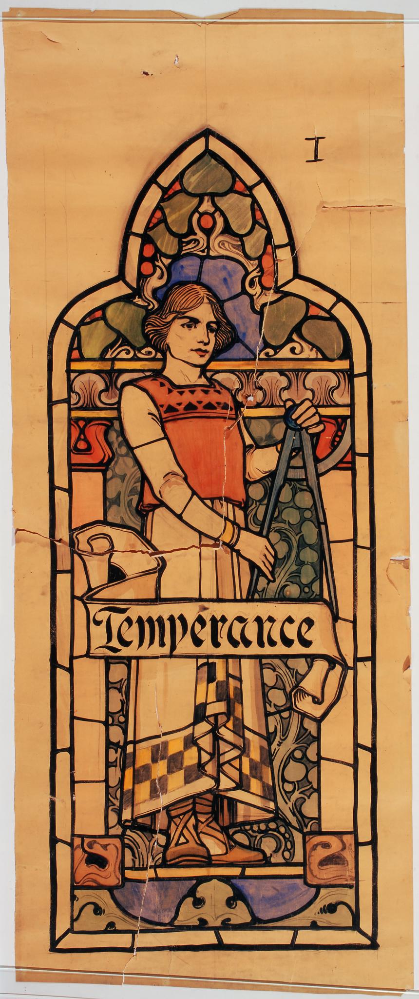 Ce carton en couleur à l’échelle 1:1 est le projet définitif pour le vitrail central de la première baie trigéminée située à gauche dans le choeur de l’église Saint-Martin de Cugy.