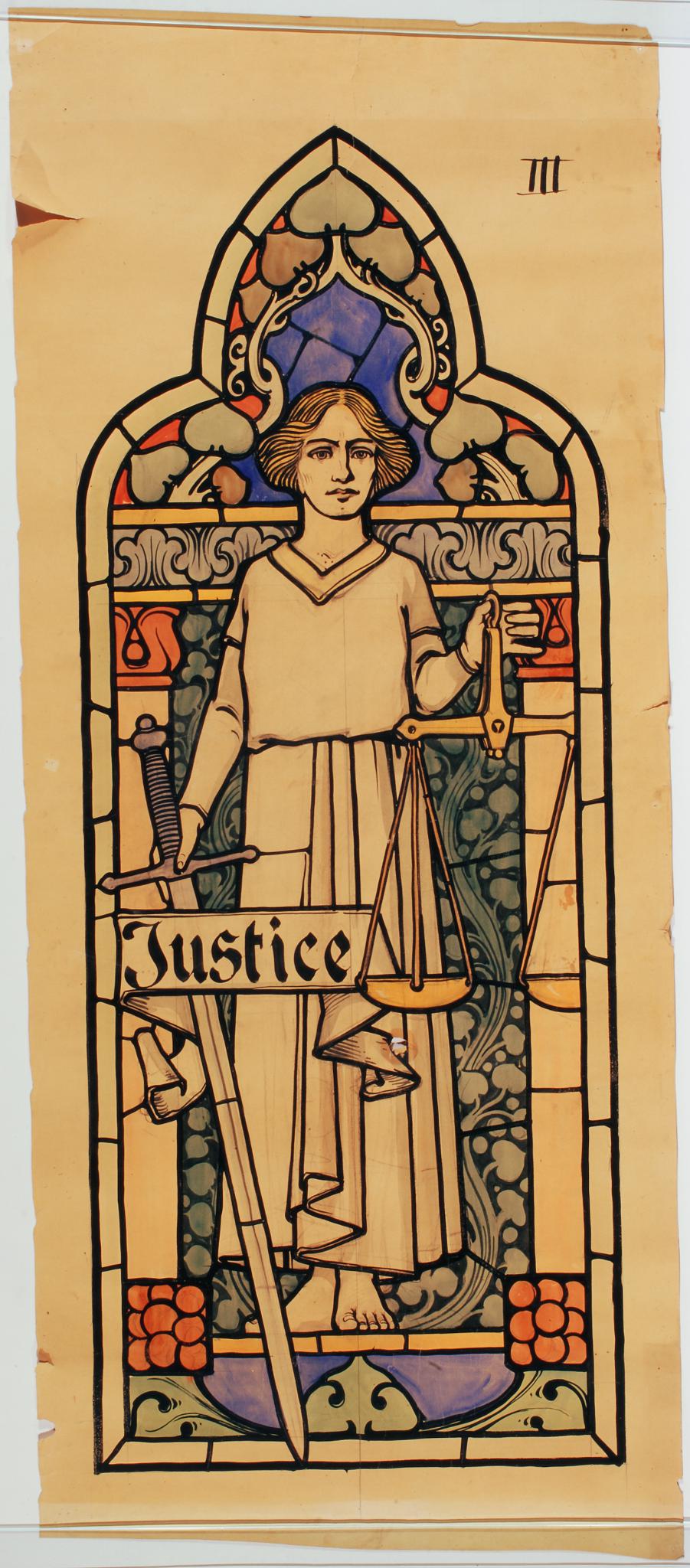Ce carton en couleur à l’échelle 1:1 est le projet définitif pour le vitrail central de la première baie trigéminée située à droite dans le choeur de l’église Saint-Martin de Cugy.
