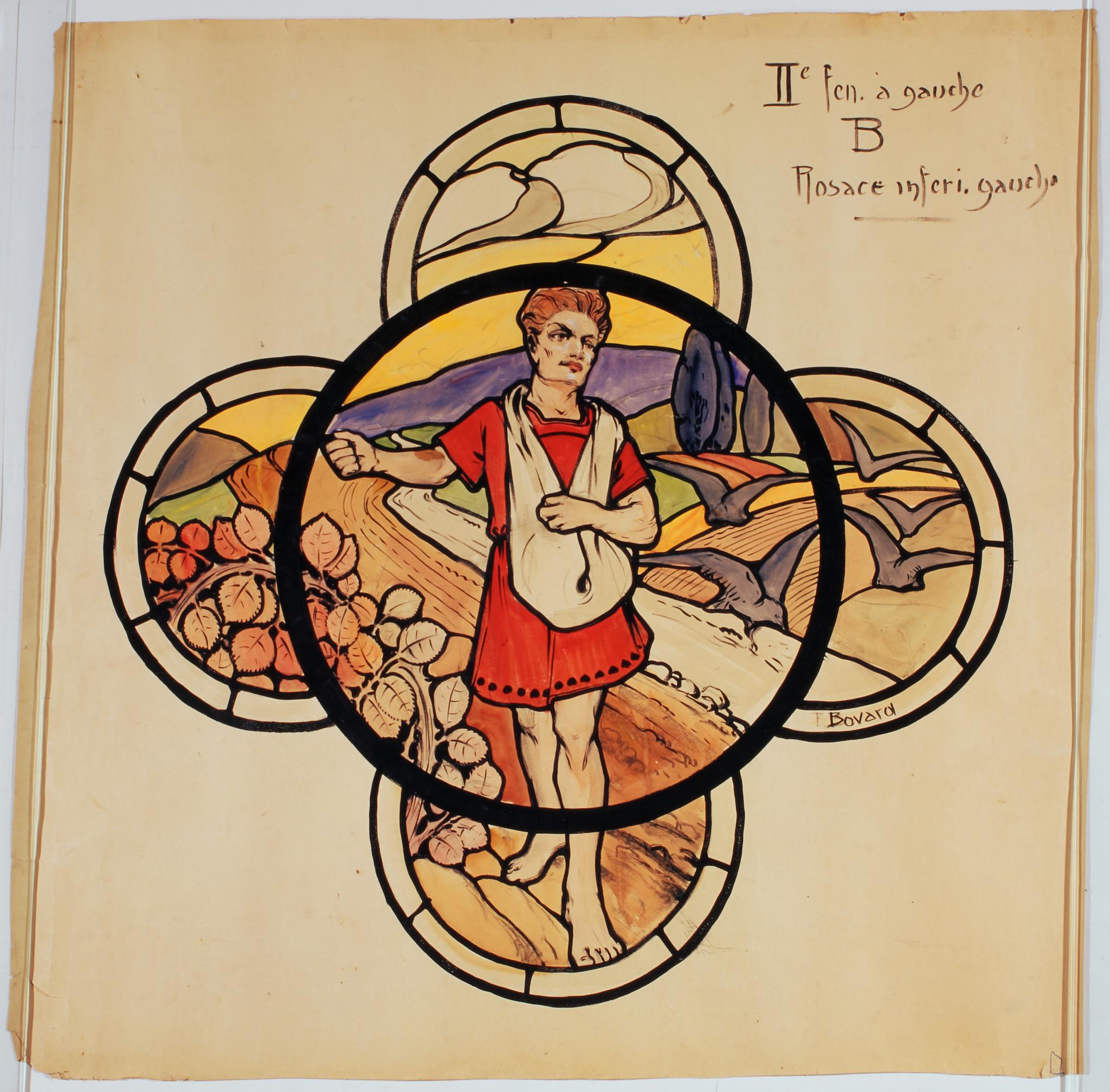 Ce carton en couleur à l’échelle 1:1 est le projet définitif pour le quadrilobe inférieur gauche de la seconde travée à gauche dans la nef de l’église Saint-Martin de Cugy, dédiée au thème “Je crois à la parole de Dieu”. Cette fenêtre comprend deux autres quadrilobes dans lesquels sont représentés le Christ enseignant et la parabole de l’ivraie et du bon grain (Pasquier, 1999, p. 17-19).