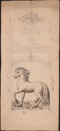 Au premier plan en bas, un cheval est présenté de profil au trot. Il figure sur de l’herbe parsemée de fleurs et de cailloux, avec au-dessus, un motif ornemental en accolade. En haut, les armoiries de Gruyères sont surmontées d’un ruban ondulé. Le nom de l’établissement “Café du Cheval Blanc” figure au-dessous.