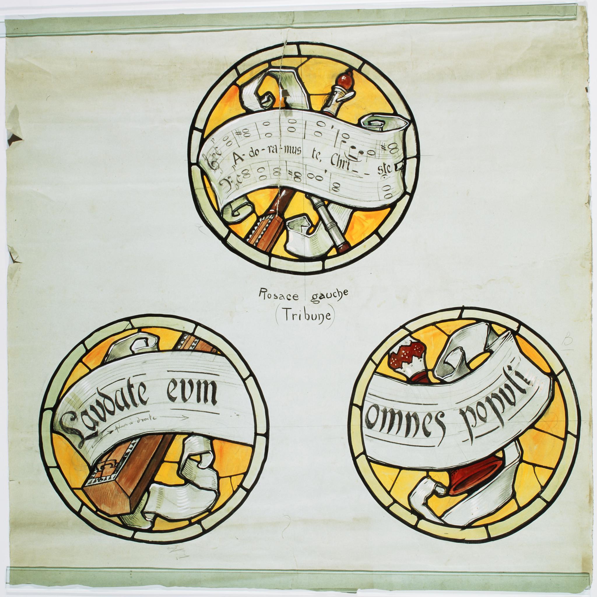 Ce carton en couleur à l’échelle 1:1 est le projet définitif pour la verrière de la tribune à droite de l’église Saint-Martin de Cugy.
