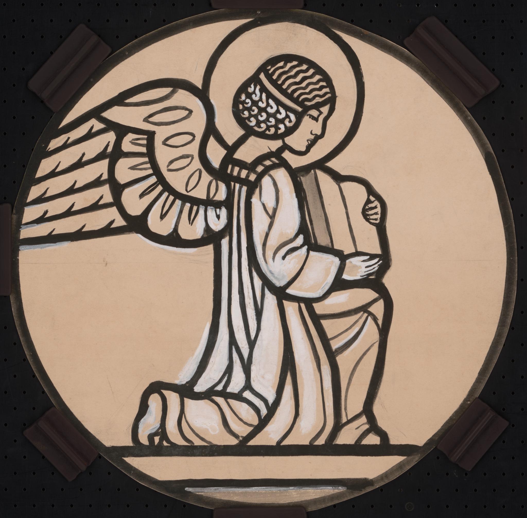Ce carton en noir et blanc est le modèle précis à l’échelle 1:1 du symbole de l’évangéliste Matthieu (ange) inscrit dans un oculus pour la partie supérieure du second vitrail à gauche dans la nef de la chapelle Sainte-Anne à Sommentier.