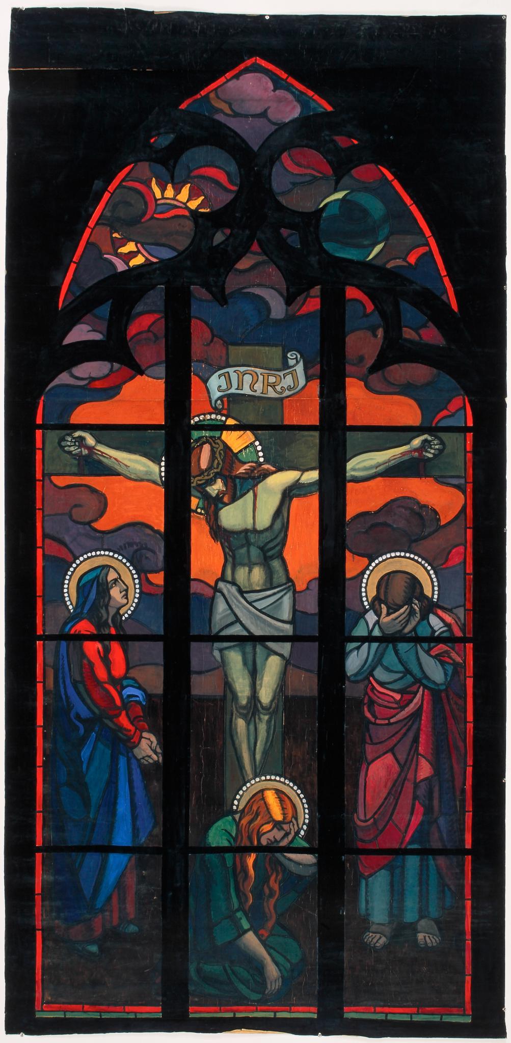 Ce carton en couleur est le modèle précis à l’échelle 1:1 du vitrail consacré à la Crucifixion pour la fenêtre axiale du choeur de l’église Saint-Aubin à Saint-Aubin.