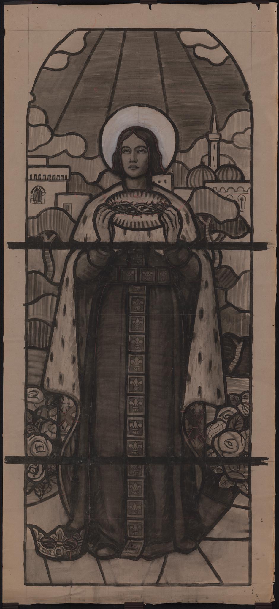 Ce carton est le modèle noir et blanc précis à l’échelle 1:1 de la partie figurée consacrée à saint Louis IX (roi de France) pour la deuxième fenêtre à droite dans la nef de l’église Saints-Pierre-et-Paul à Villars-sur-Glâne.