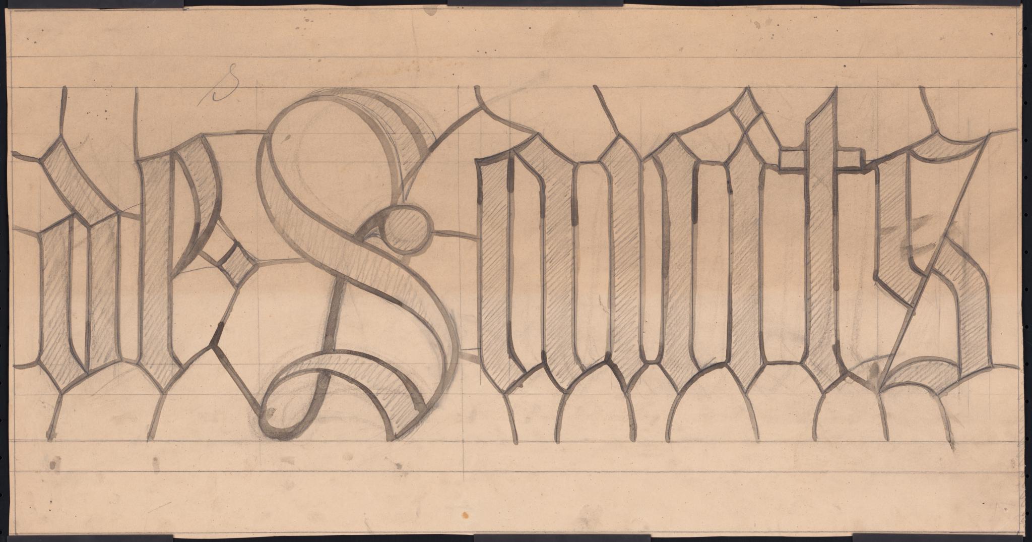 Inscription partielle en lettres gothiques pour le bas d'un vitrail. L’artiste a interverti les lettres “i” et “n”.