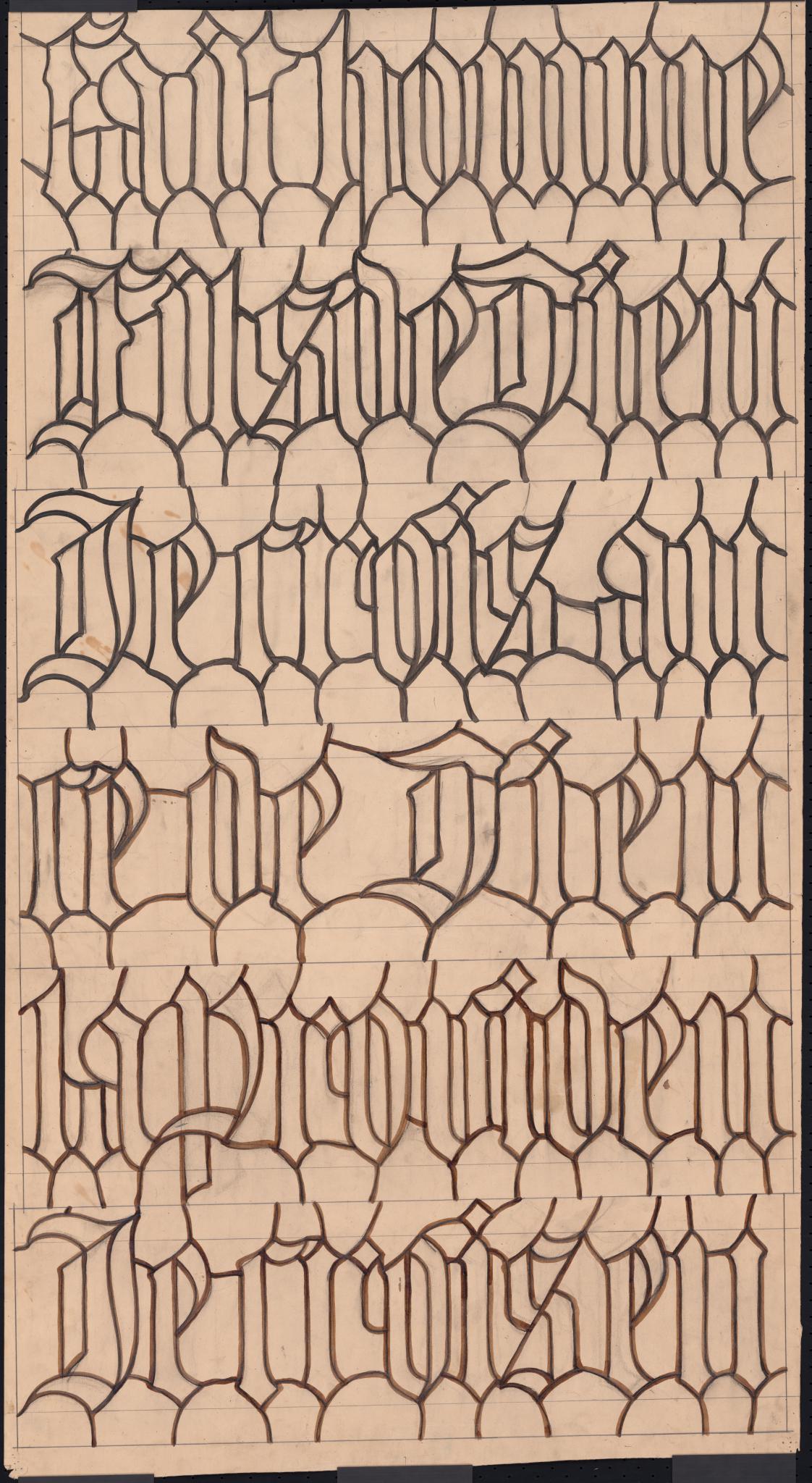 Ce carton en noir et blanc à l’échelle 1:1 est le projet définitif pour les inscriptions se situant sur les banderoles au bas des lancettes pour la première verrière à gauche et la seconde fenêtre à droite dans la nef de l’église Saint-Martin de Cugy.