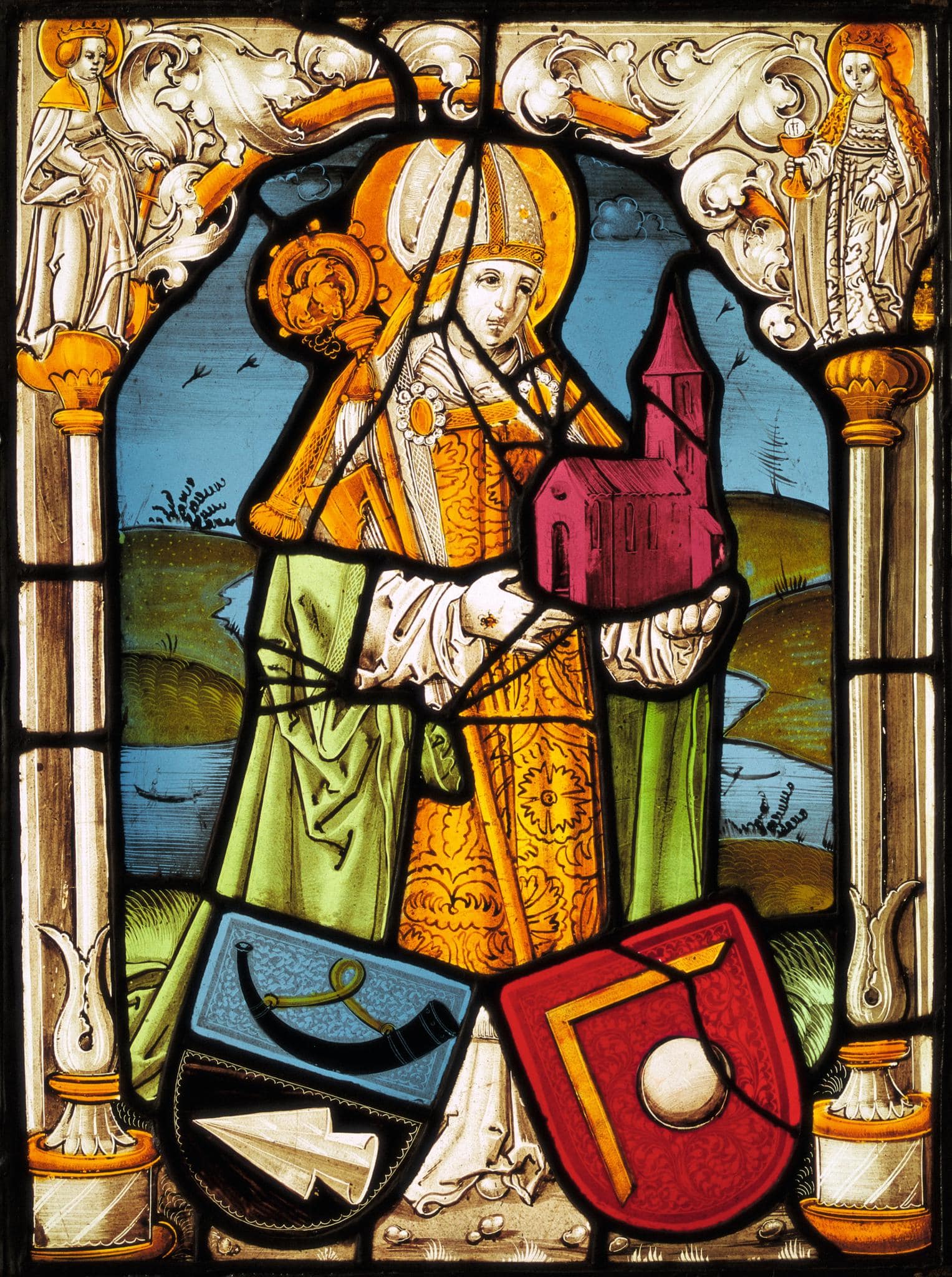 Figurenscheibe um 1517: Hl. Wolfgang mit unbekannten Wappen