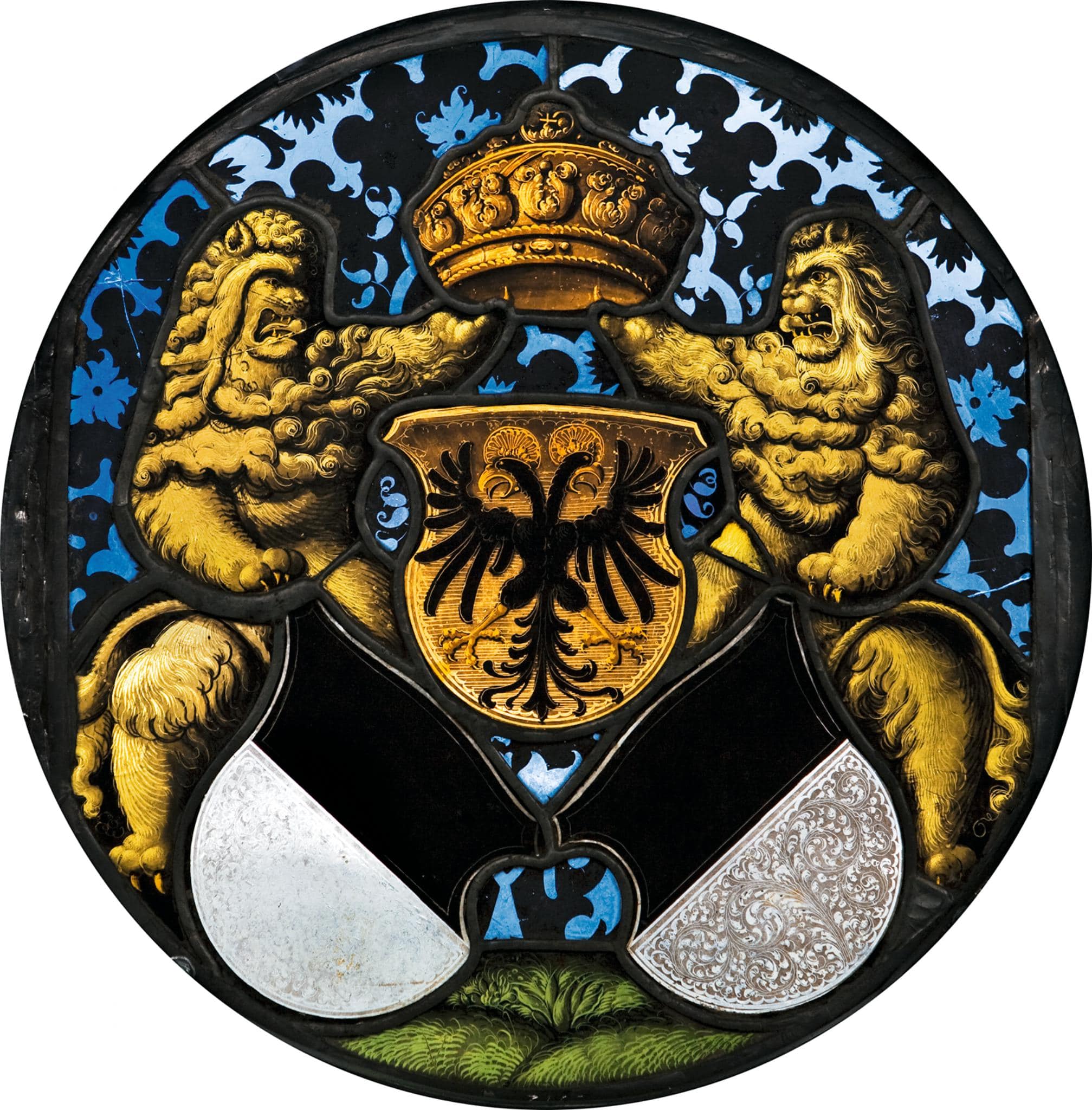 Farbloses, blaues und grünes Glas. Gelbes Glas in verschiedenen Farbtönen. Bemalung mit Schwarzlot und Silbergelb.